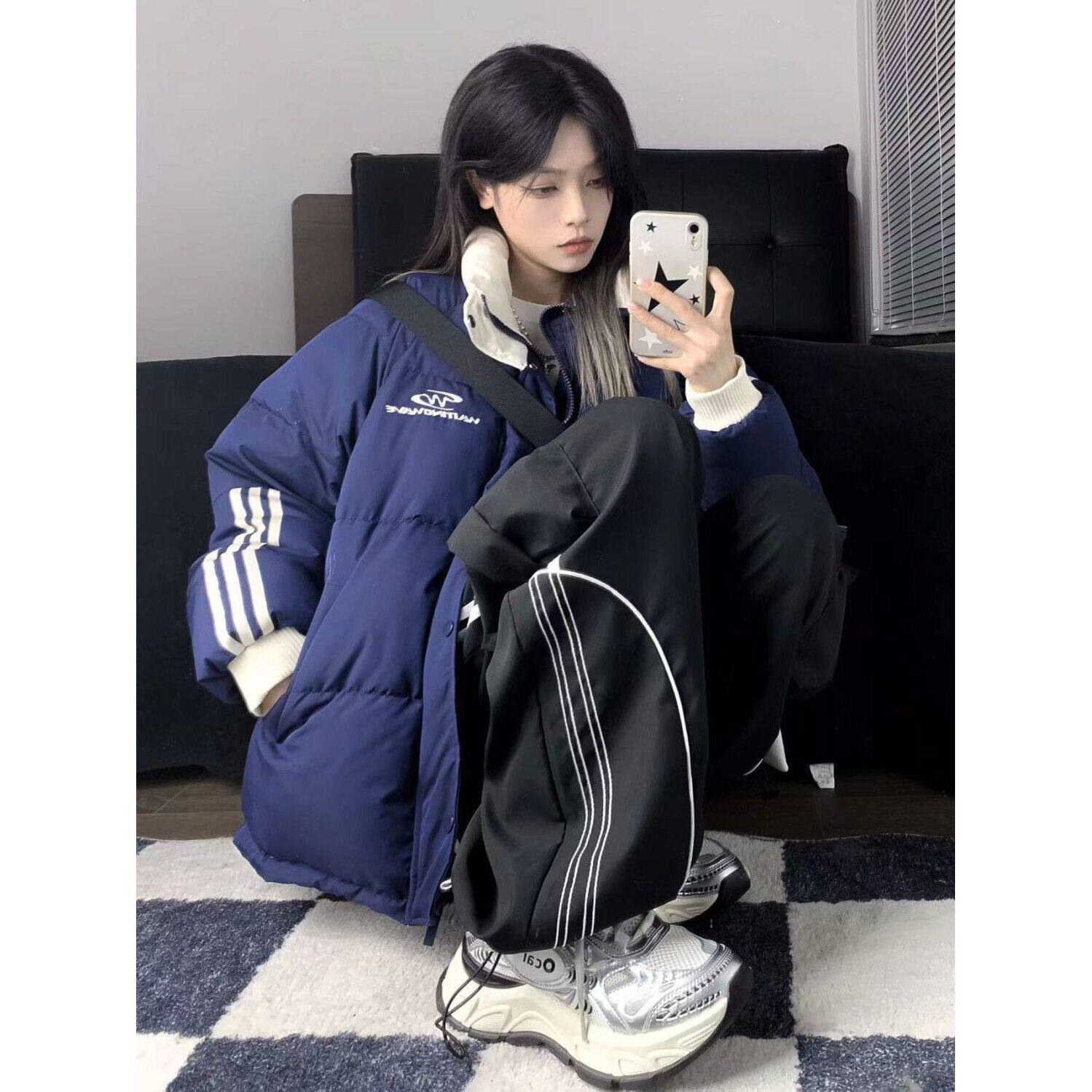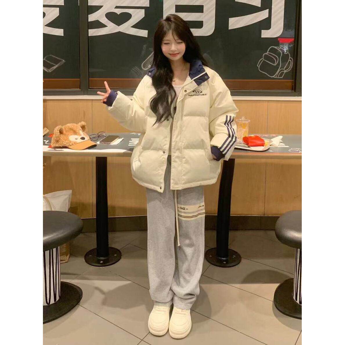浅杏色拼接撞色条纹三杠立领棉服女冬季新款保暖宽松百搭学生外套