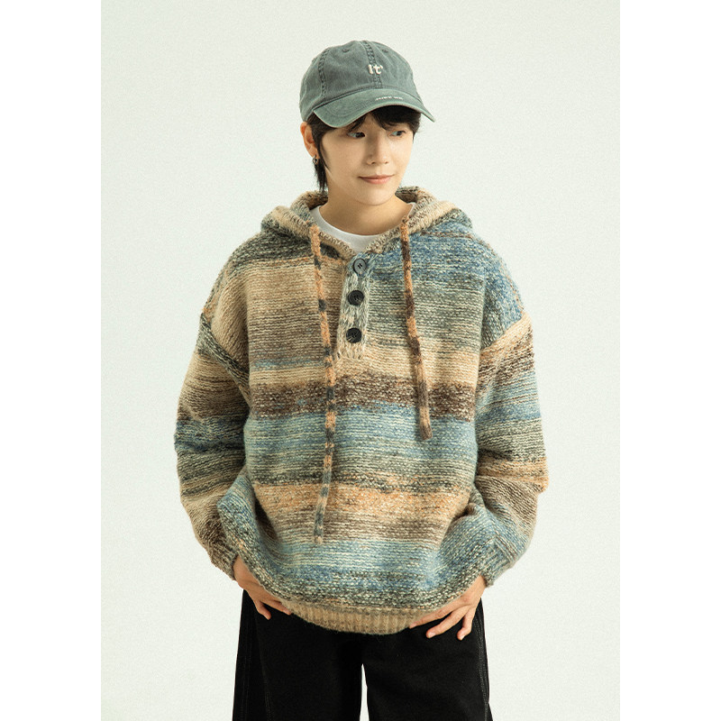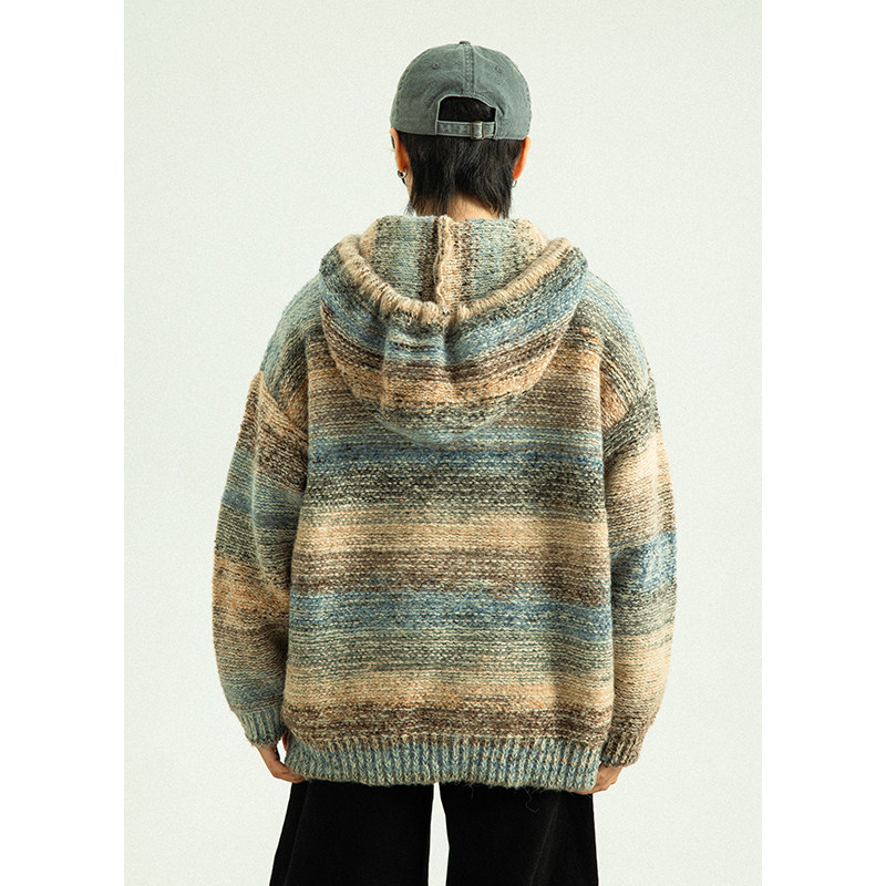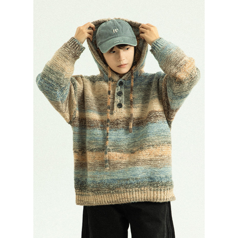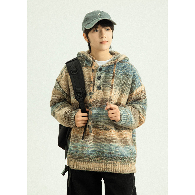 GoodNorth日系复古撞色渐变连帽毛衣男女款秋冬宽松针织卫衣帽衫