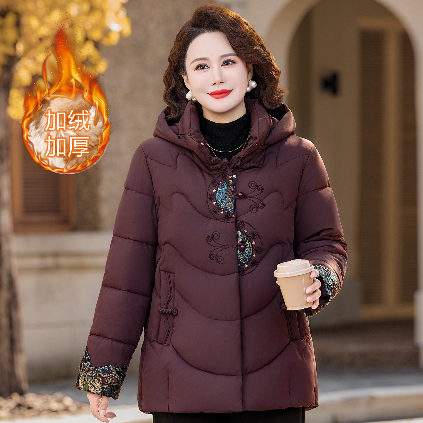 加绒加厚棉服女款2025新款冬季连帽中长款妈妈装超好看冬装厚外套