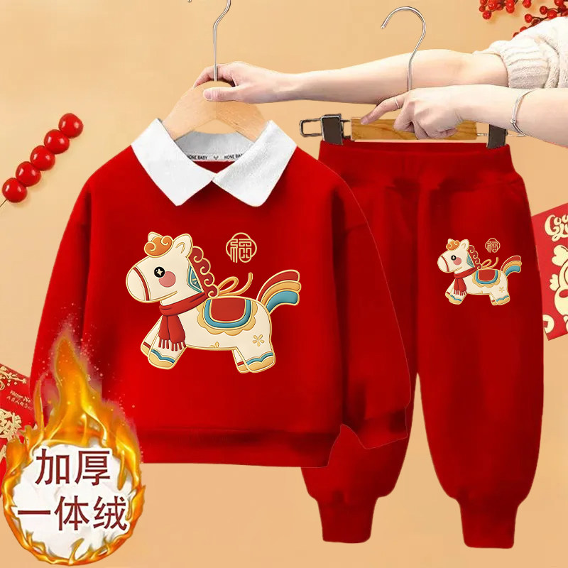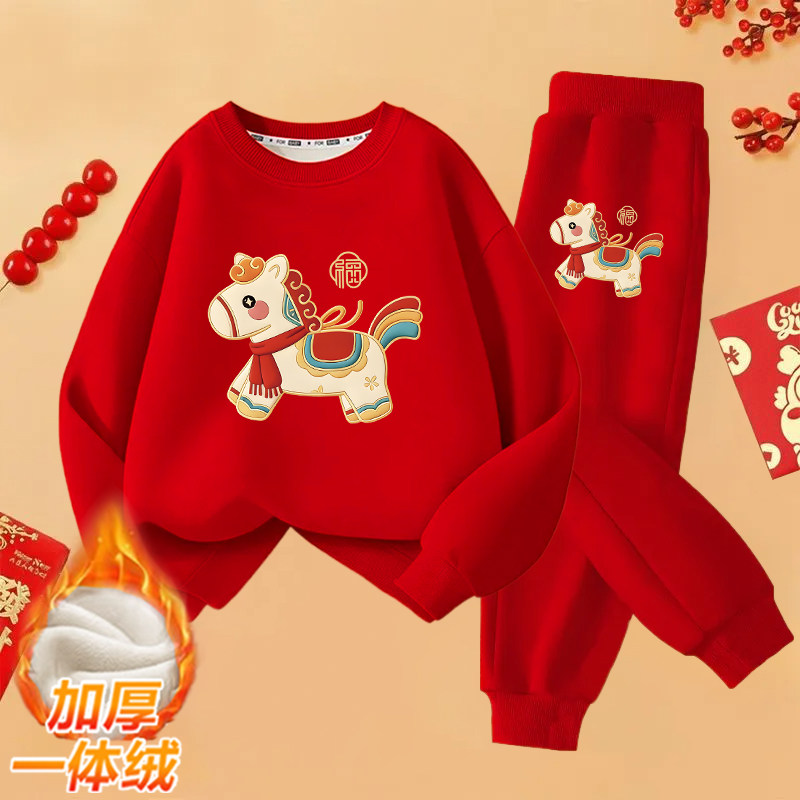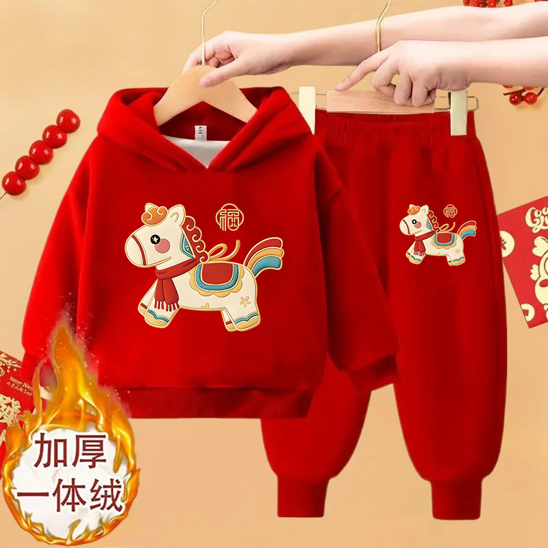 男童女童2026马年红色喜庆卫衣卫裤两件套儿童加绒加厚一体绒套装