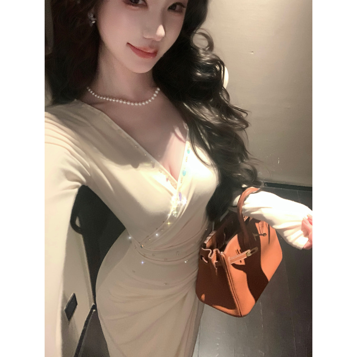 Sun雅乔【白色梦境】2026春装修身亮片钉钻腰抽皱V领长袖连衣裙