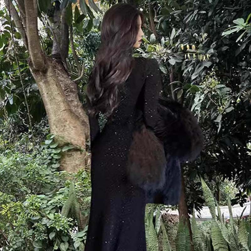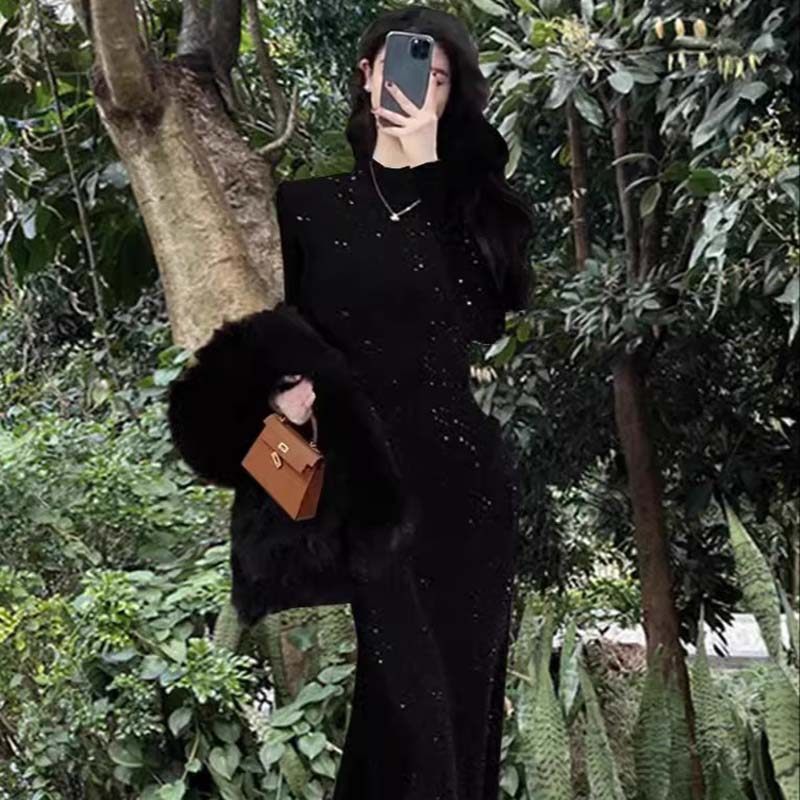 高级感黑色连衣裙女2026春秋新款打底裙包臀鱼尾半高领长裙D4158