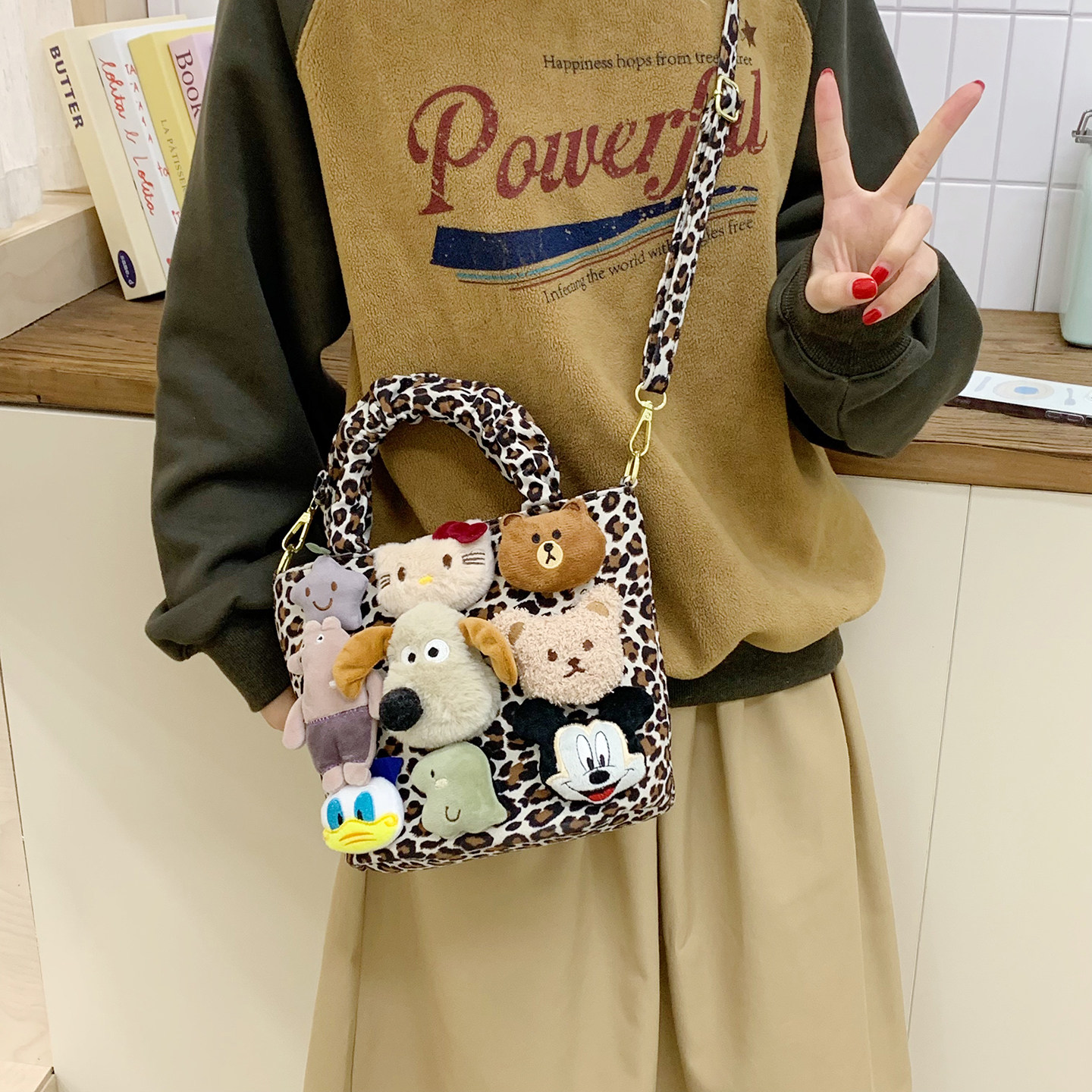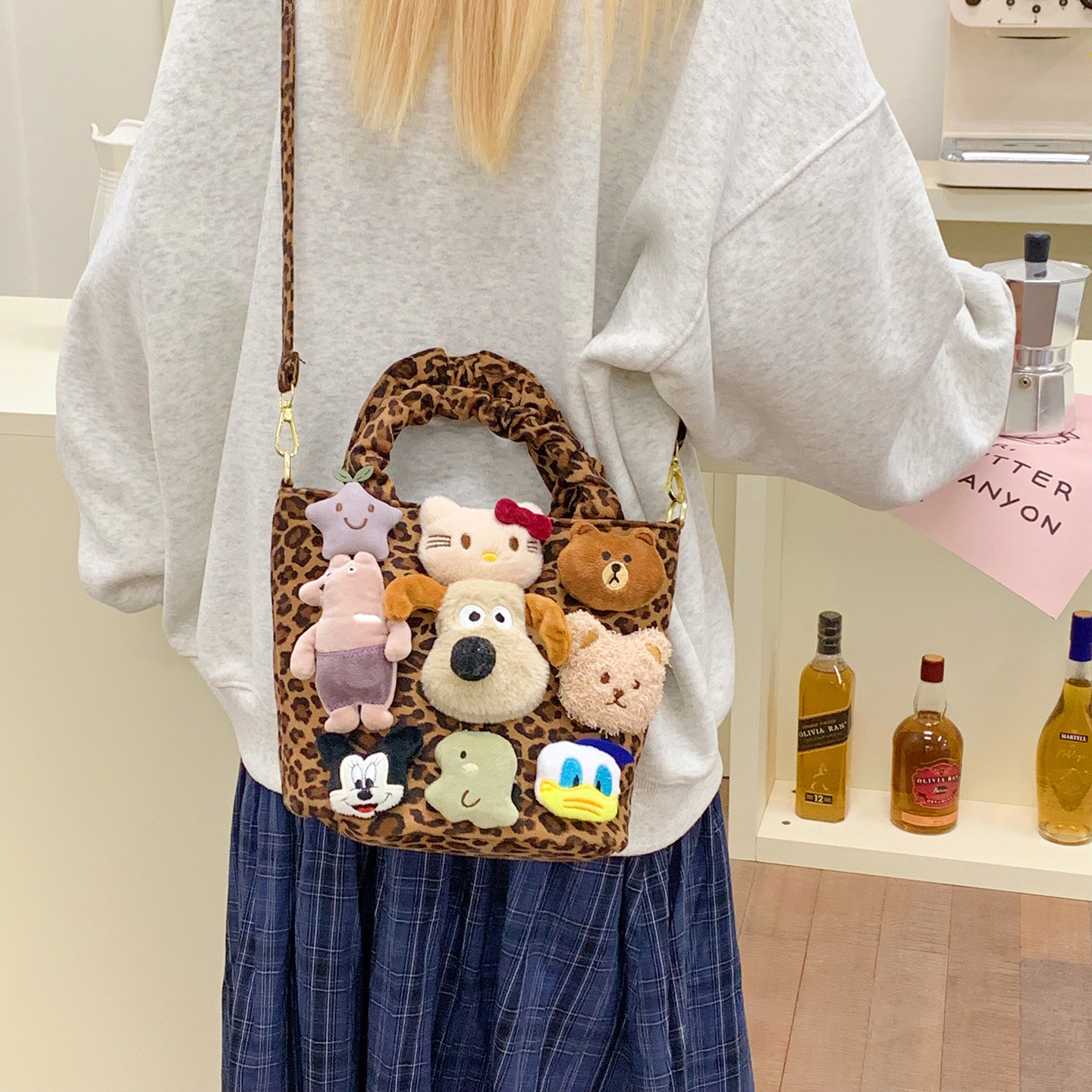 超火小众豹纹帆布包包女款秋冬流行百搭斜挎包可爱卡通手提水桶包