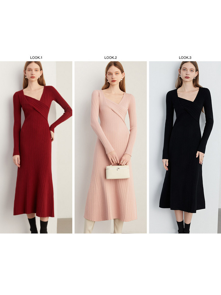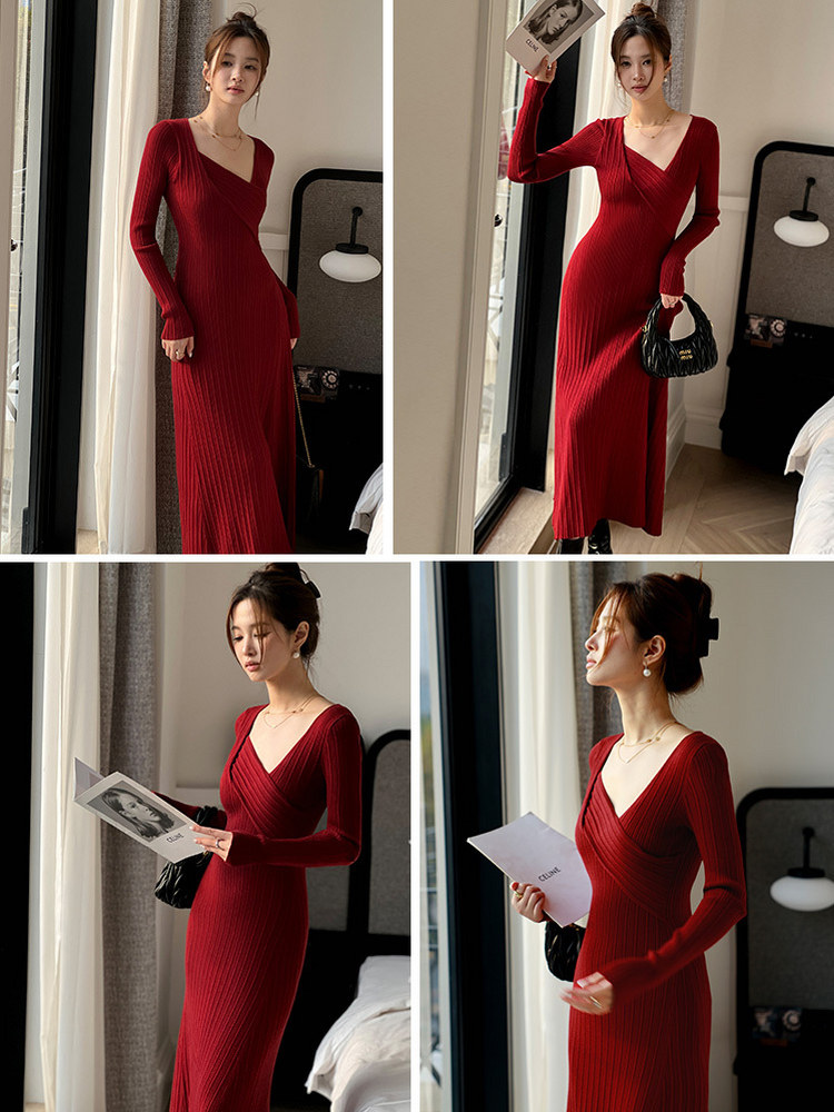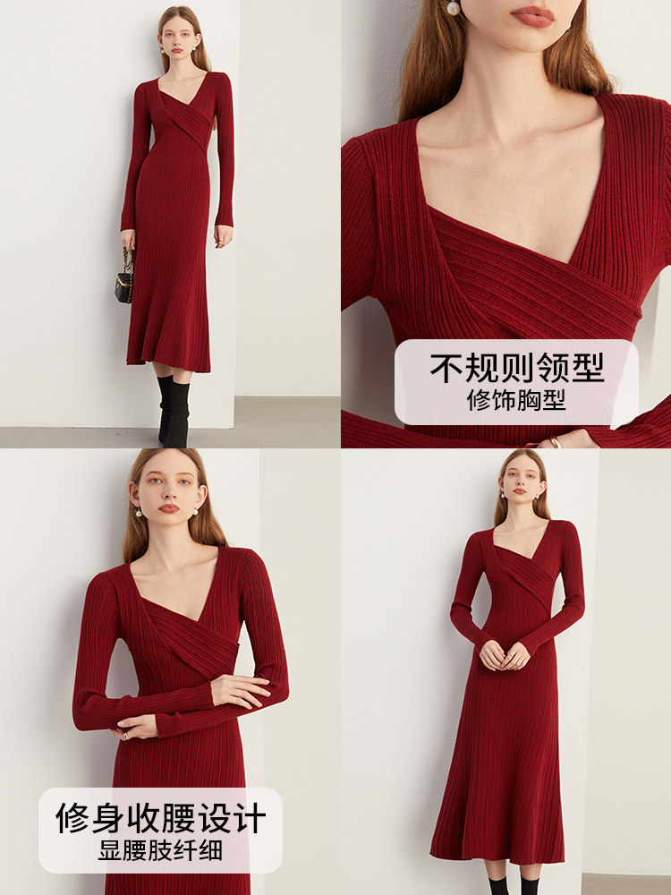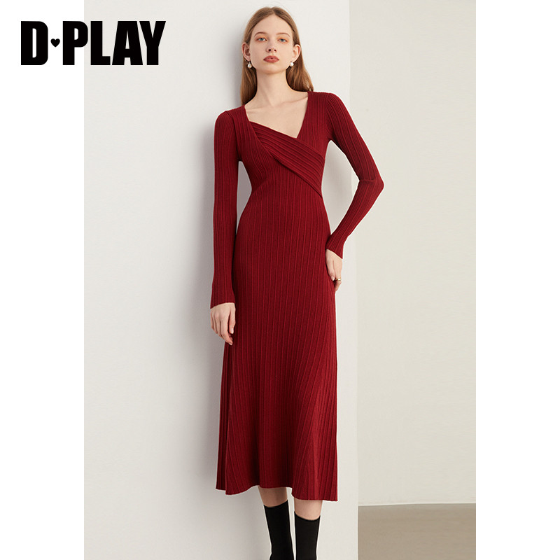 DPLAY春装新法式风不规则红色修身长款针织连衣裙订婚女