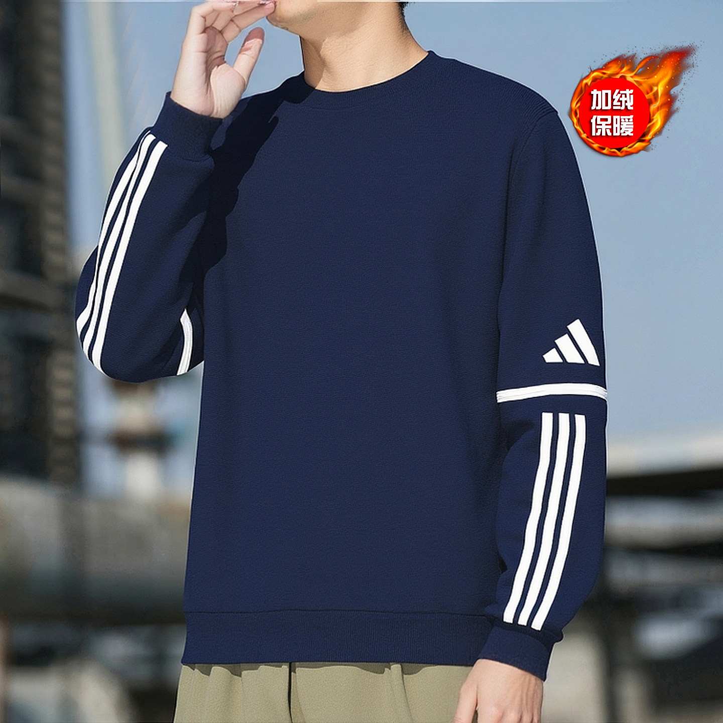 阿迪达斯加绒卫衣男冬季新款宽松运动服圆领打底衫篮球蓝色上衣