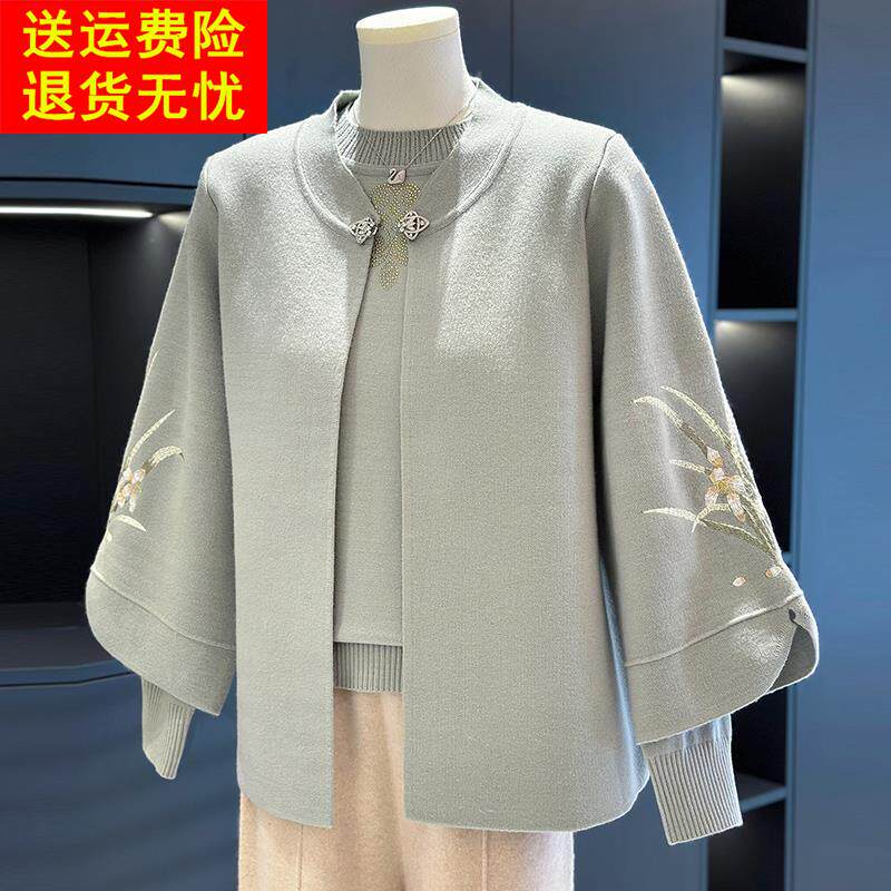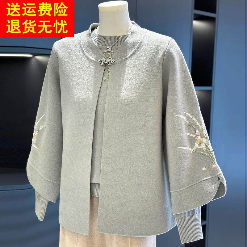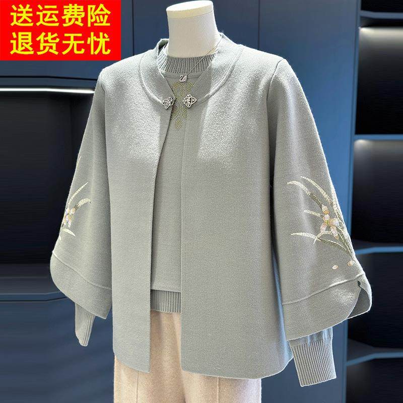 时尚中老年针织衫套装女开衫冬装新款奶奶上衣服大码妈妈装两件套