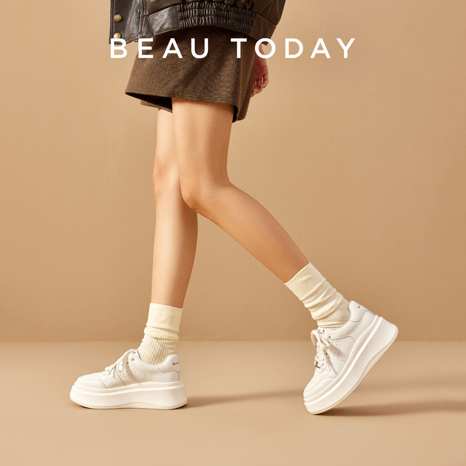 BeauToday厚底鞋女款春季BT魔术贴小白鞋白色鞋子板鞋内增高女鞋