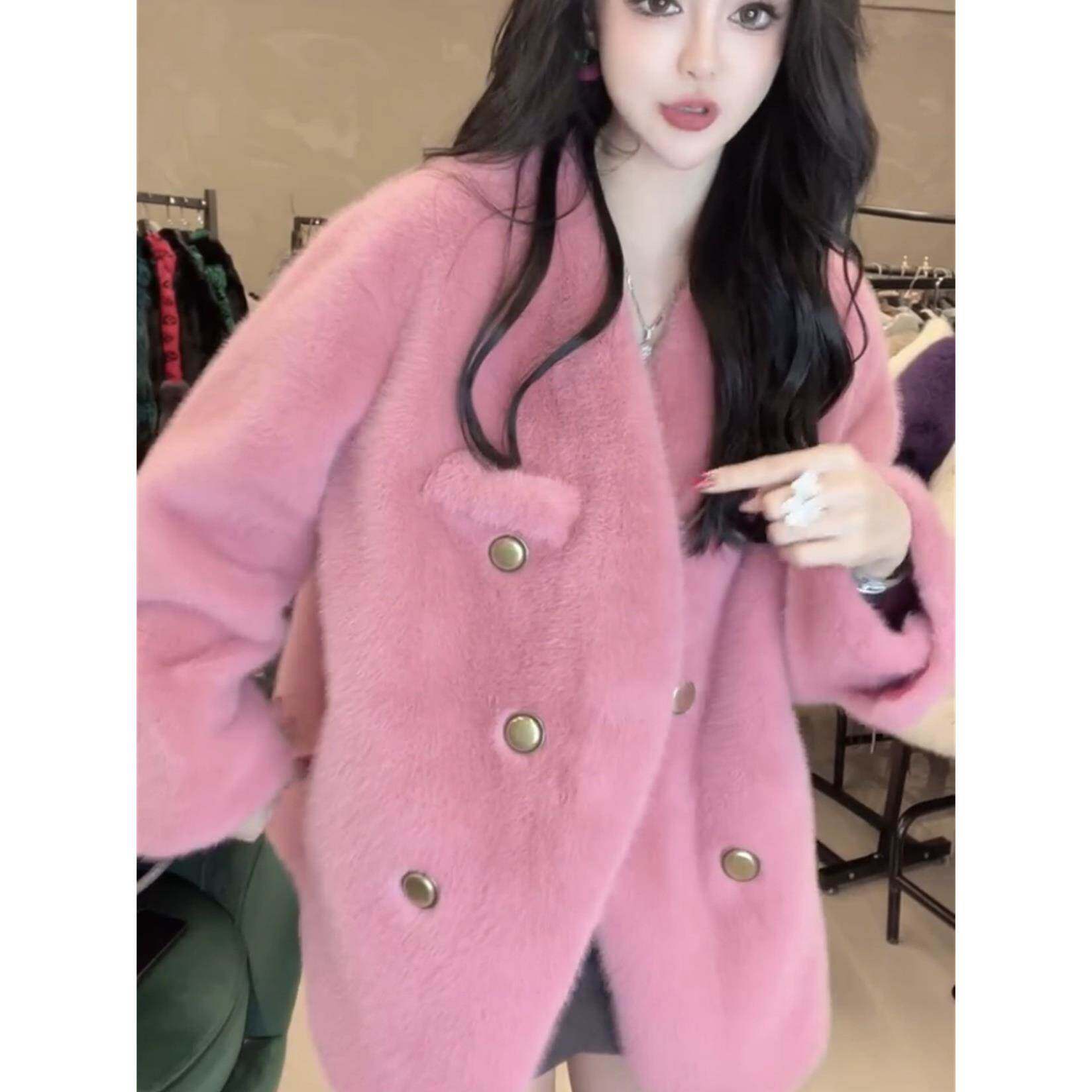 香港秋冬新款高级感粉色加厚皮草外套女小香风时尚洋气休闲大衣潮