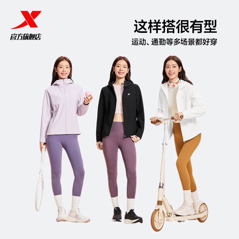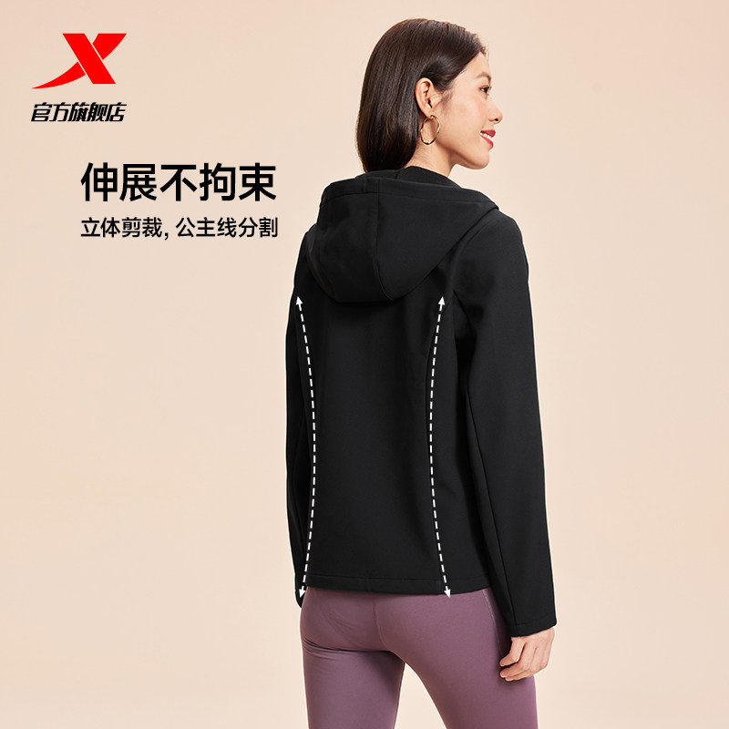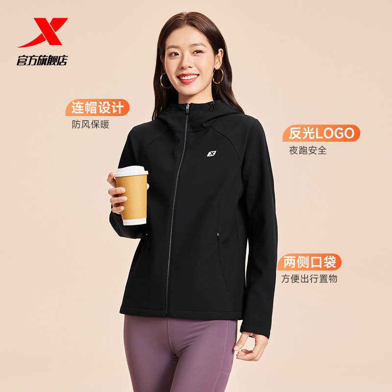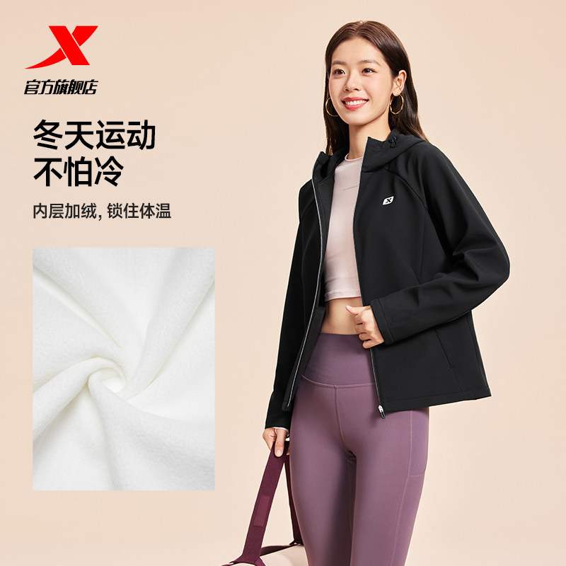 特步加绒外套女士秋冬新款训练女装休闲运动上衣保暖冲锋夹克风衣