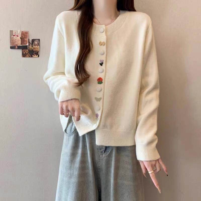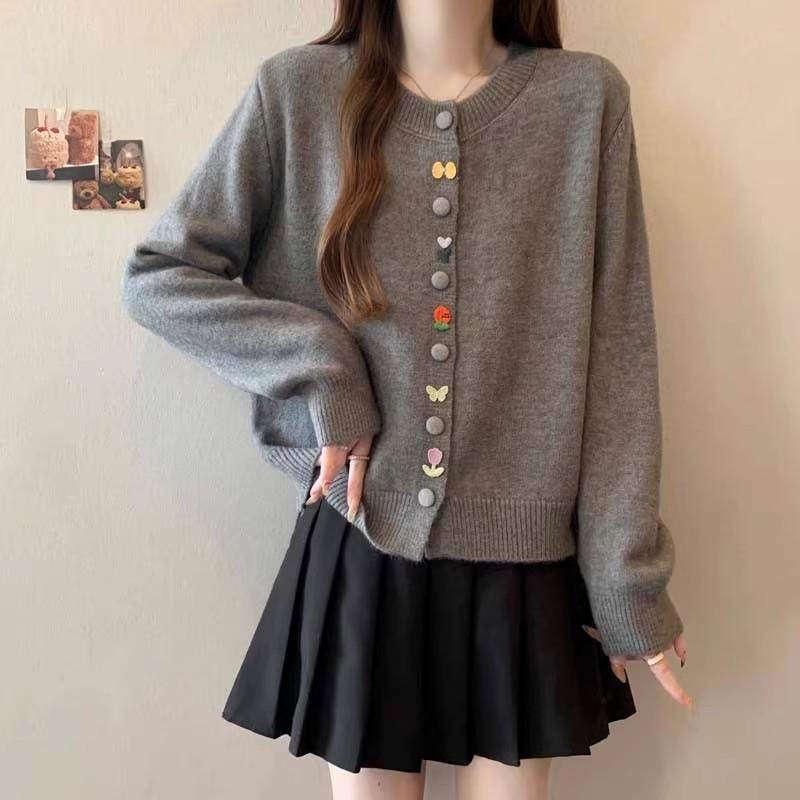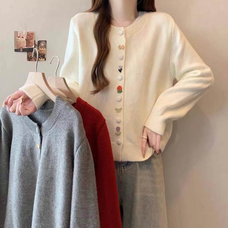 彩色纽扣圆领针织开衫女秋冬新款温柔风软糯显瘦慵懒毛衣外套上衣