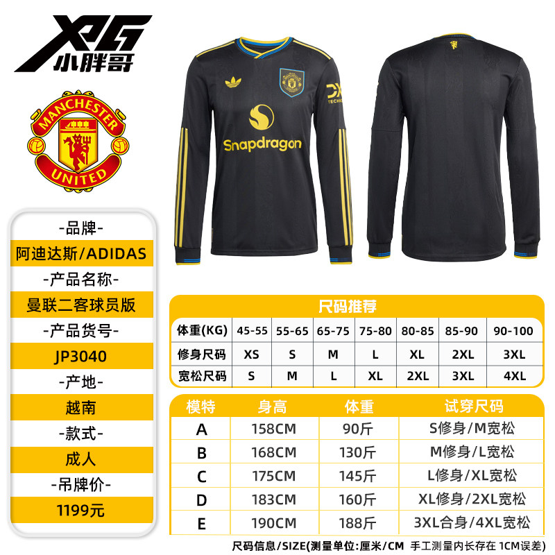 小胖哥XPG阿迪达斯25-26曼联第二客场球员版球衣长袖足球服成人男
