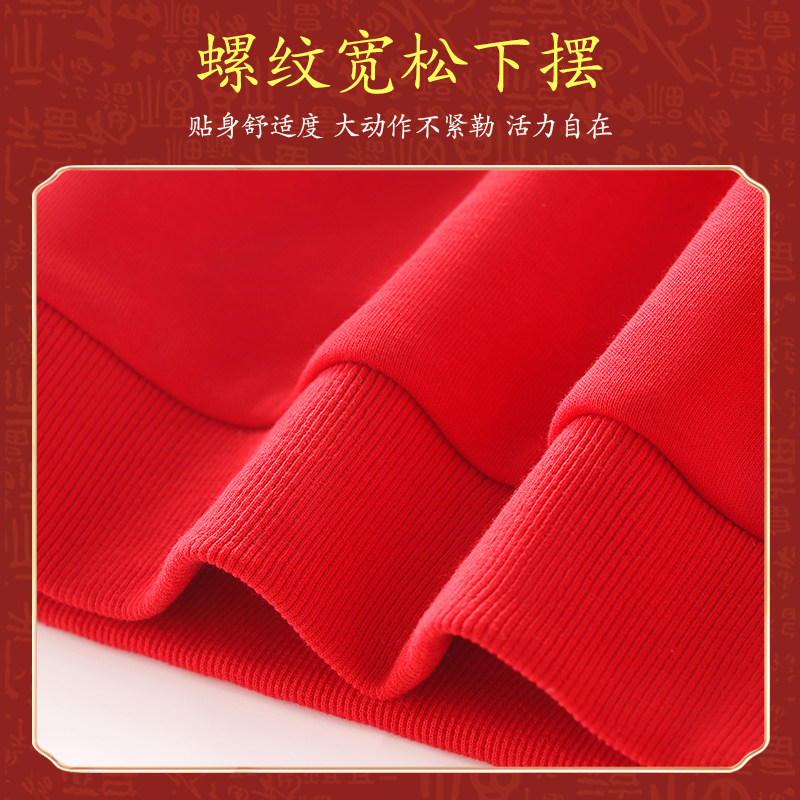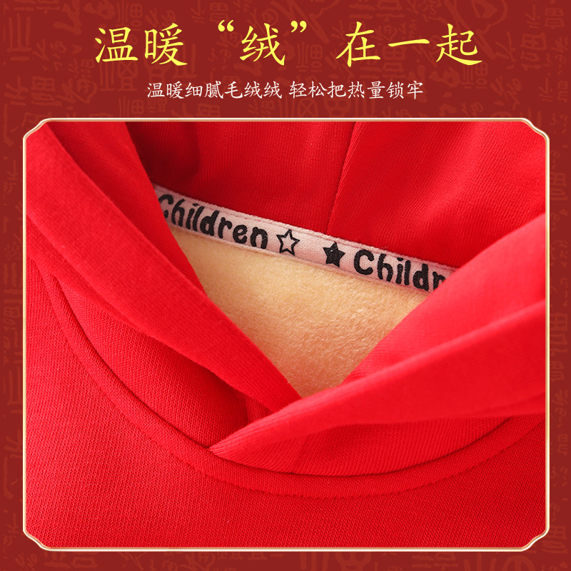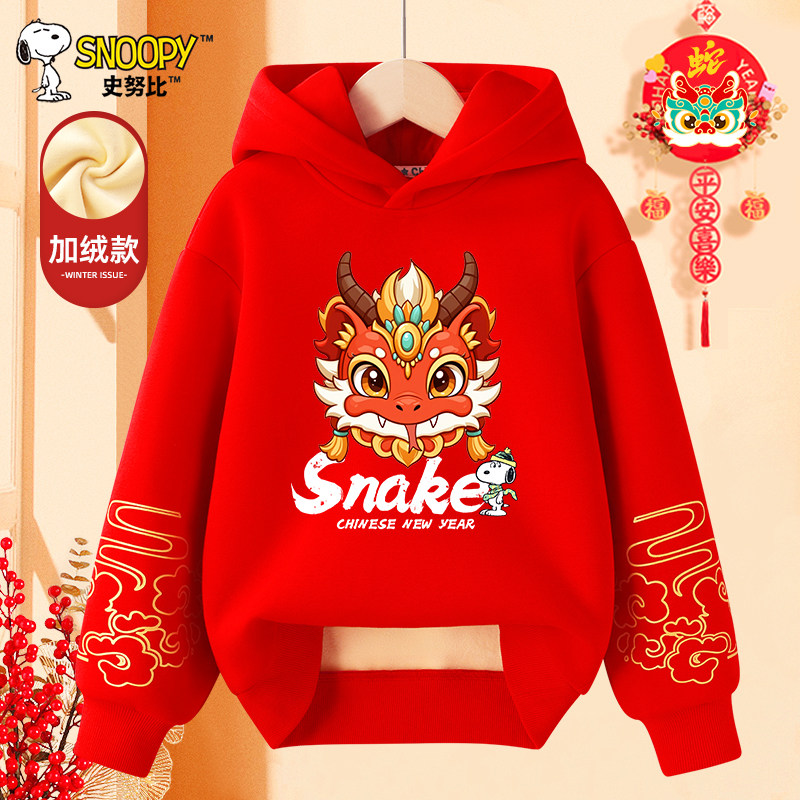 史努比儿童拜年服马年男童红色喜庆本命年衣服中国风加绒连帽卫衣