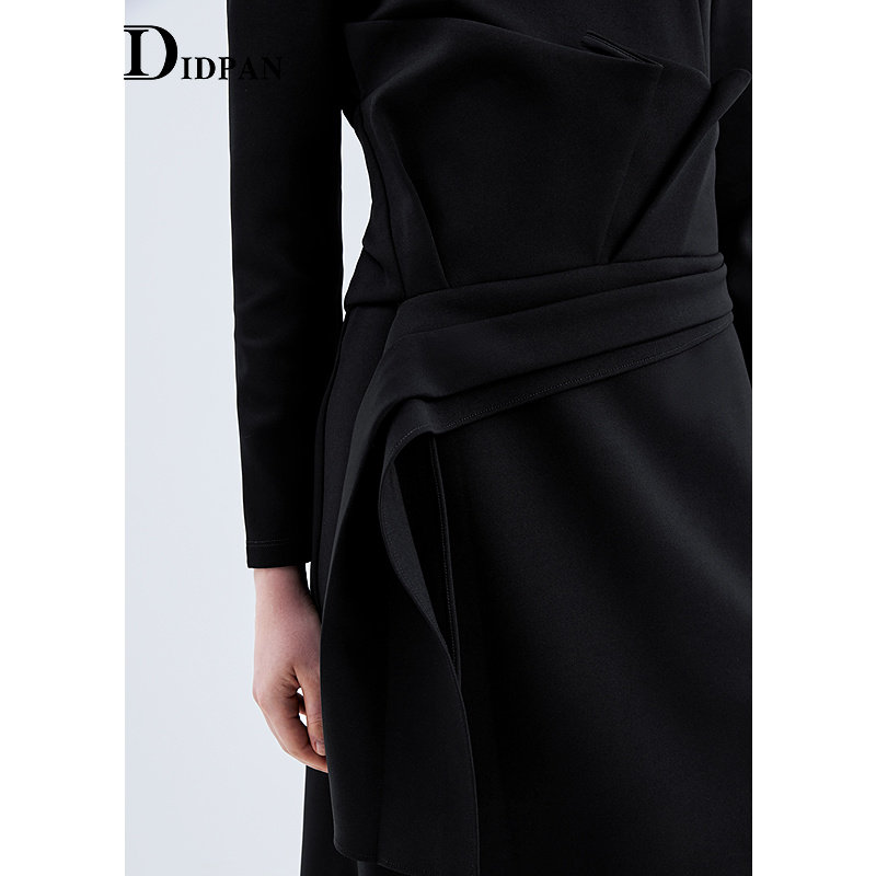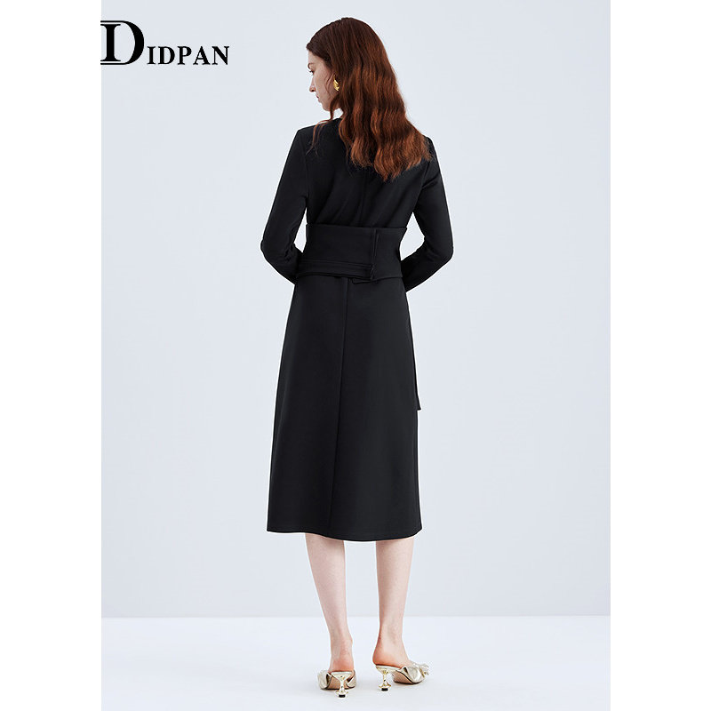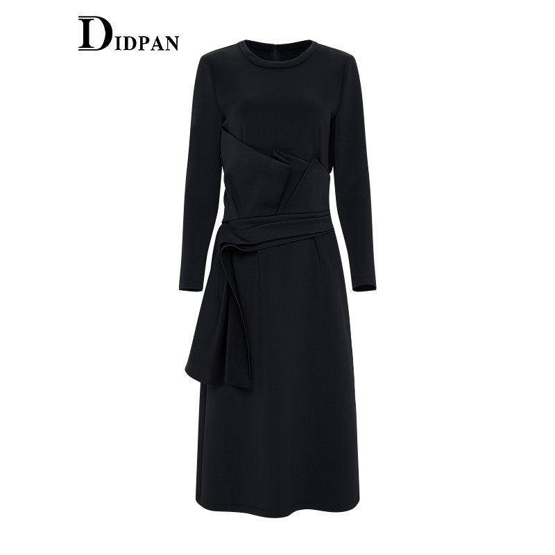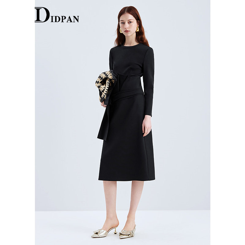 IDPAN长袖连衣裙女春季新款气质简约百搭收腰显瘦设计感裙子