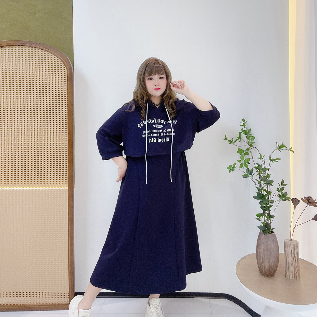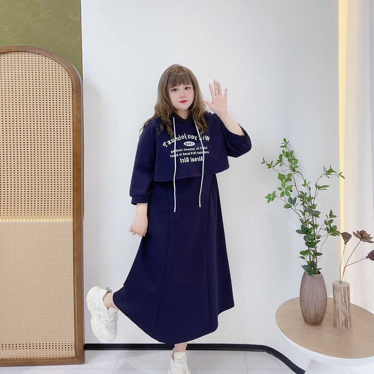 休闲遮肉套装胖仙女莹莹大码女装胖mm短款印花连帽卫衣吊带连衣裙