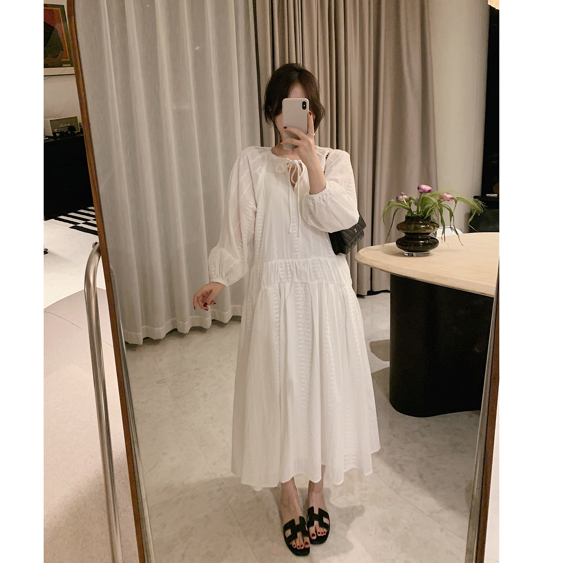 misslady法式复古系带气质刺绣白色长袖连衣裙宽松梨形身材友好