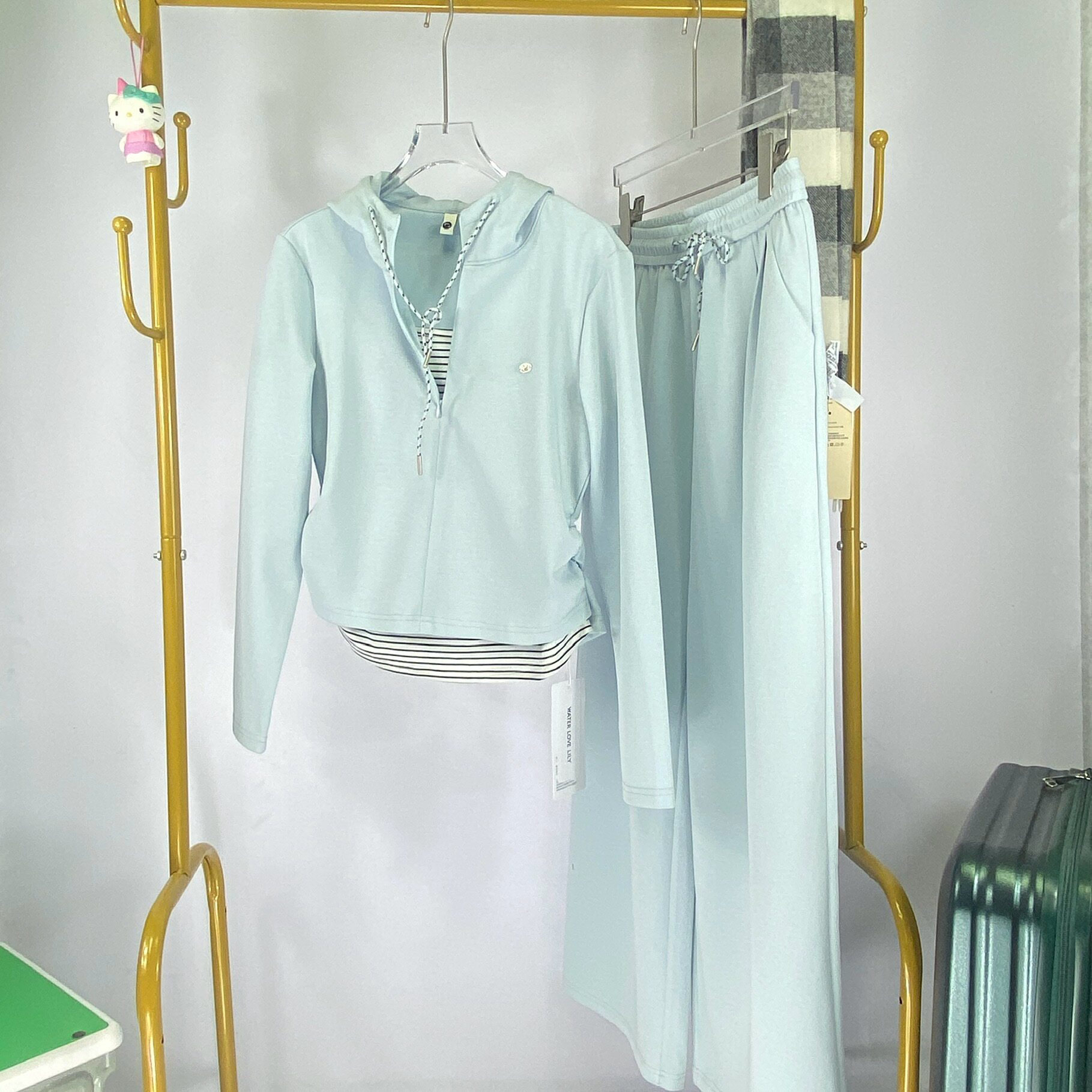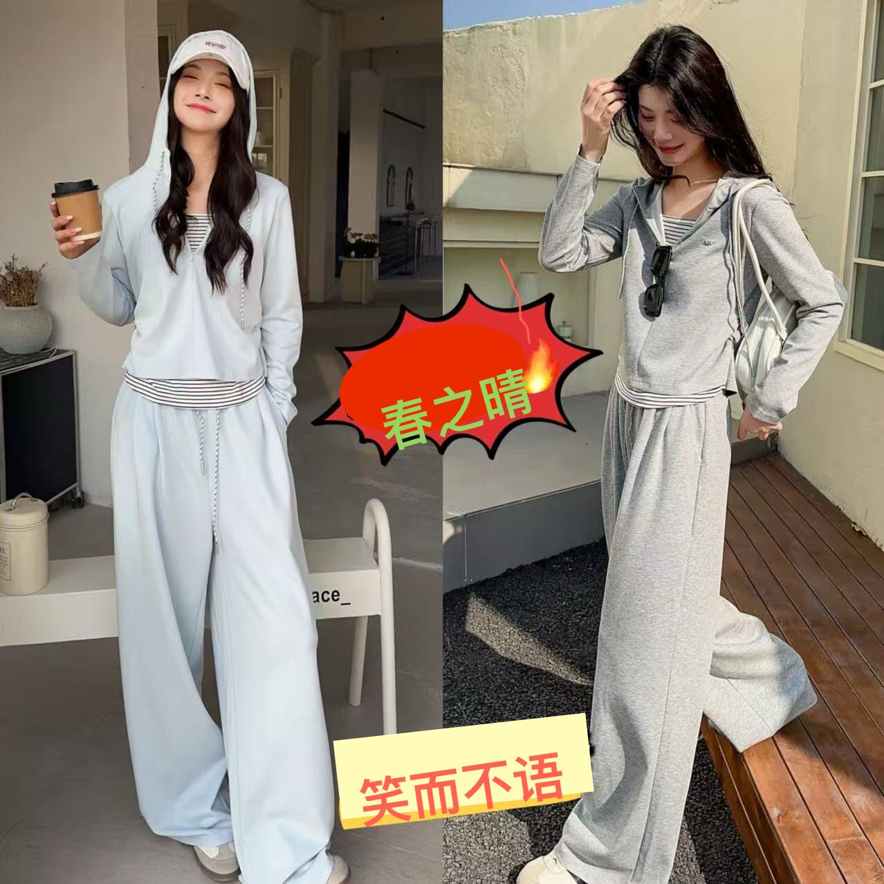 2026春季新款韩版收腰显瘦女款连帽长袖上衣松紧腰阔腿裤套装