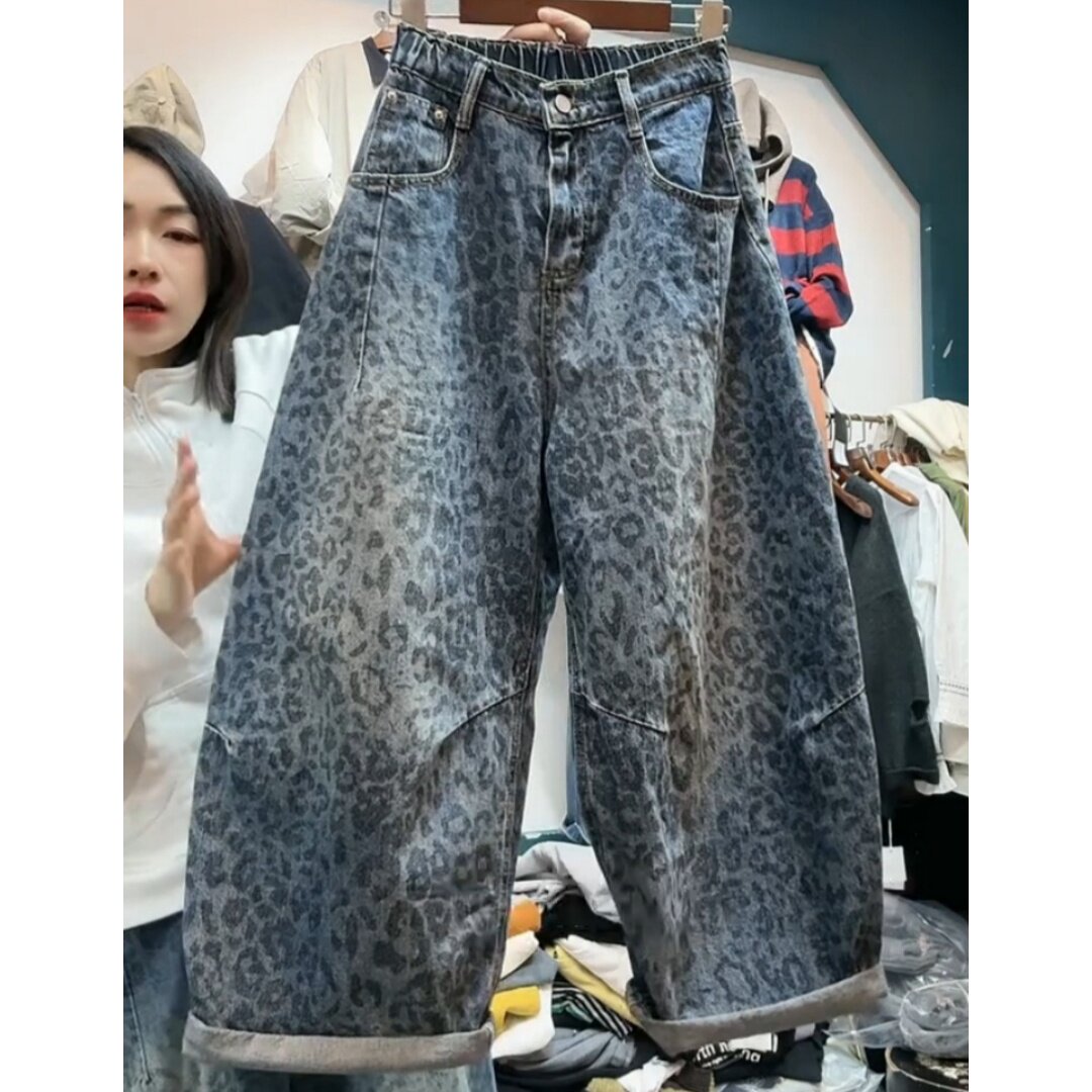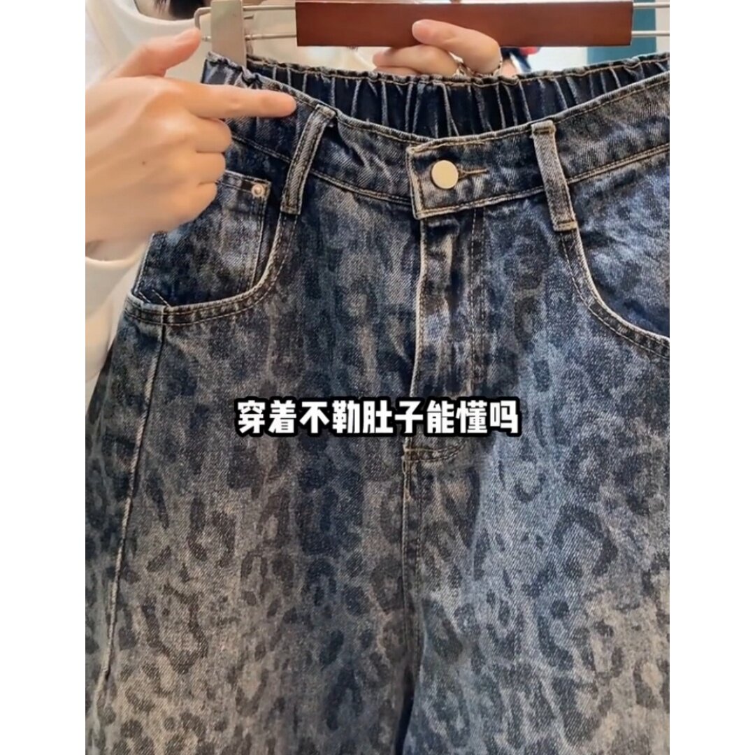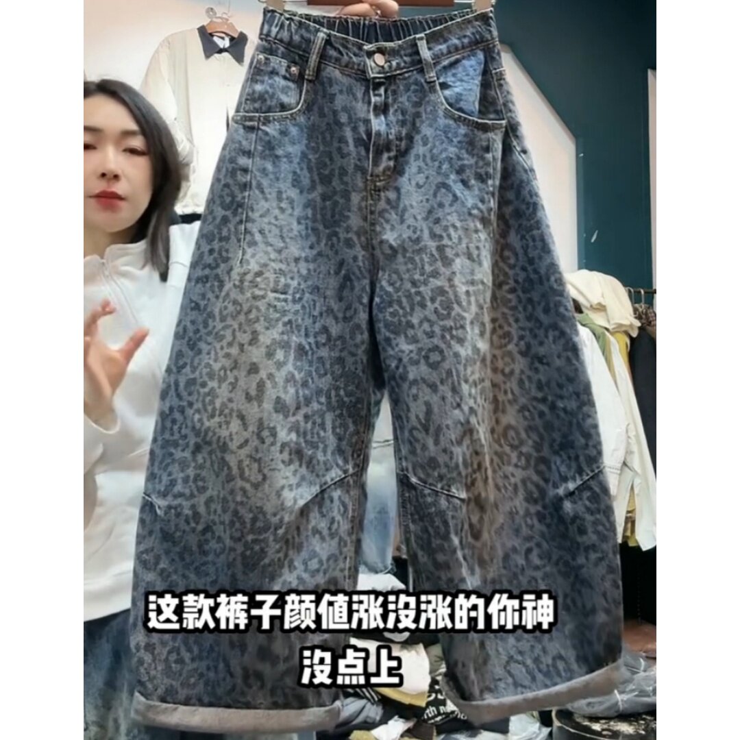 蓝色水洗豹纹时尚牛仔裤2026年早春新款高腰显瘦阔腿弯刀裤