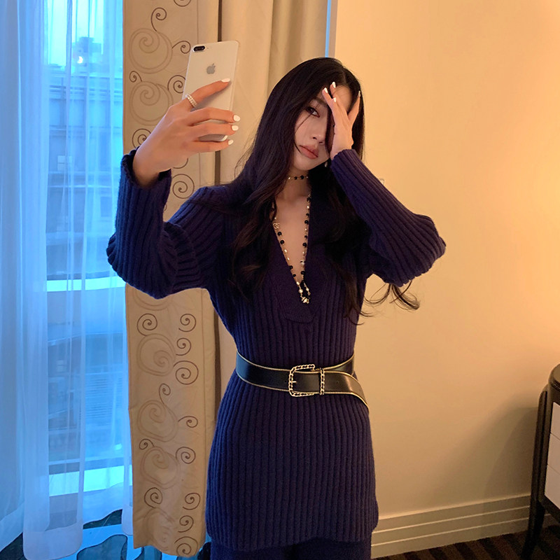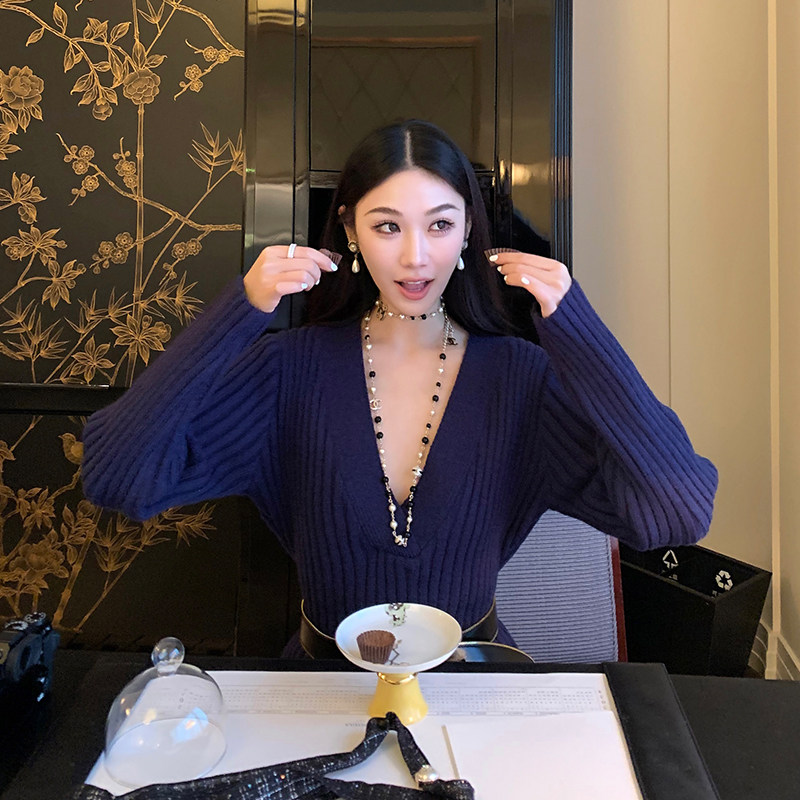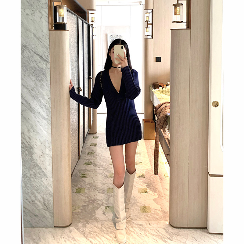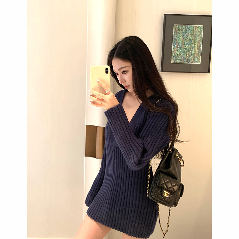 Boamarket 藏青v领毛衣百搭收腰修身显瘦气质长袖针织连衣裙短裙