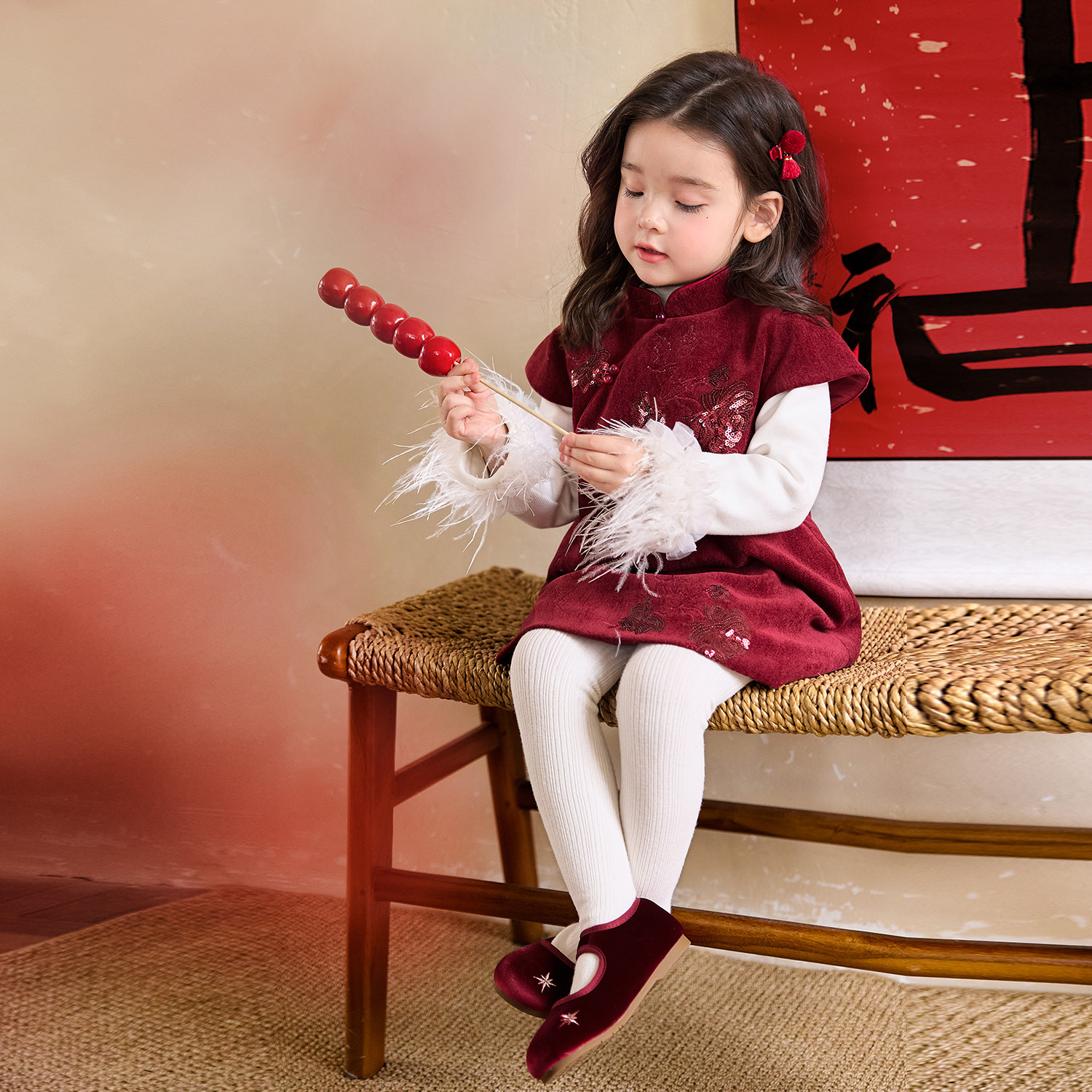 小O宝童装 宝宝新中式刺绣连衣裙女2026新款女童红色喜庆过年衣服