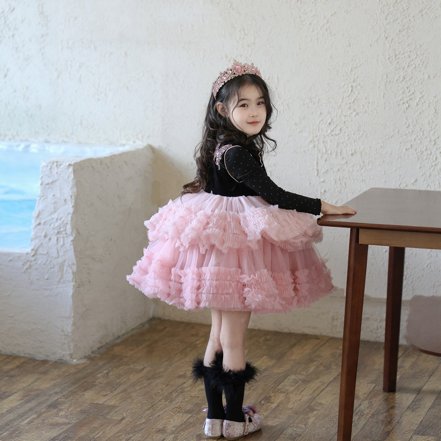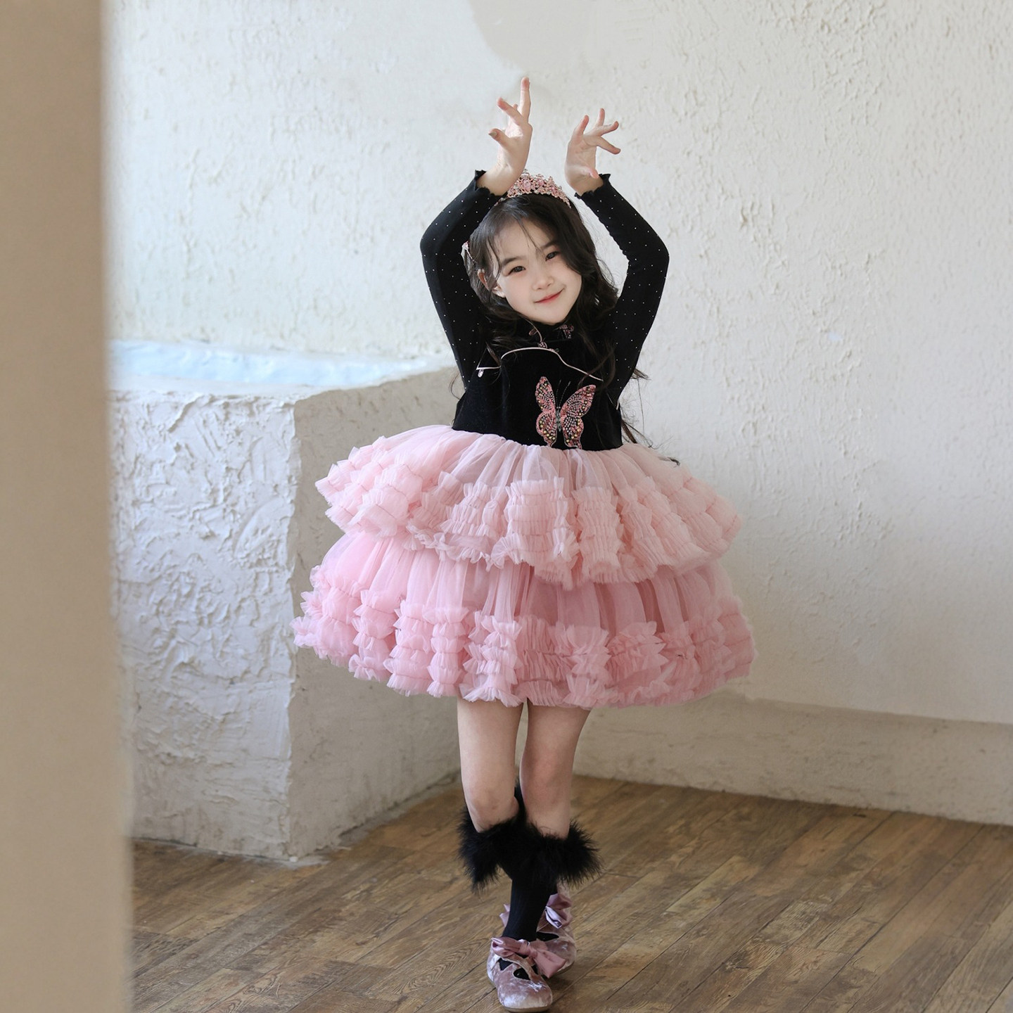 女童新中式粉色蛋糕裙连衣裙2025冬新款女孩加绒公主裙生日表演裙