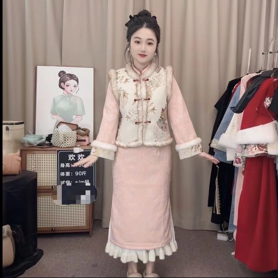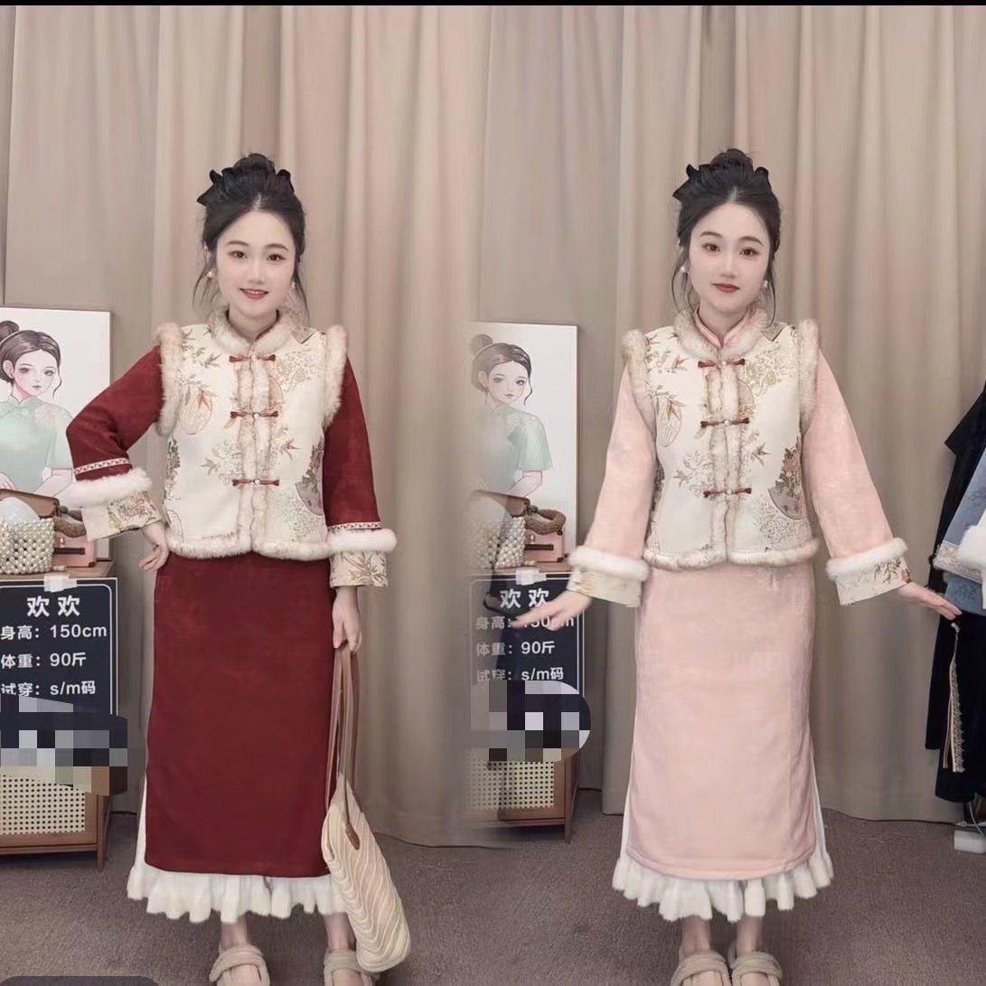 新中式刺绣马甲显瘦套装2025冬季新款加绒加厚拜年服小个子连衣裙
