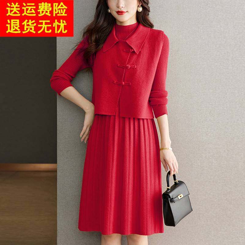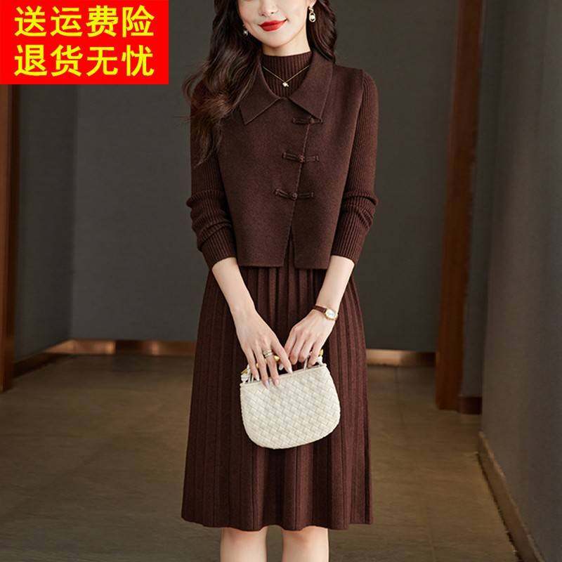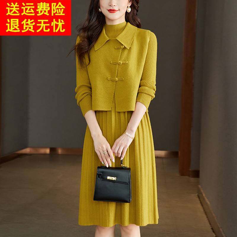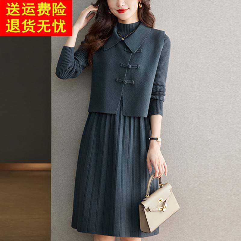 连衣裙女士秋冬一整套针织马甲毛衣裙两件套翻领妈妈装长款套装裙
