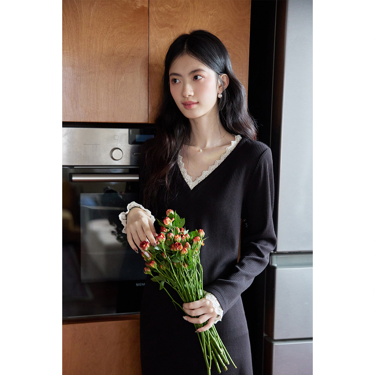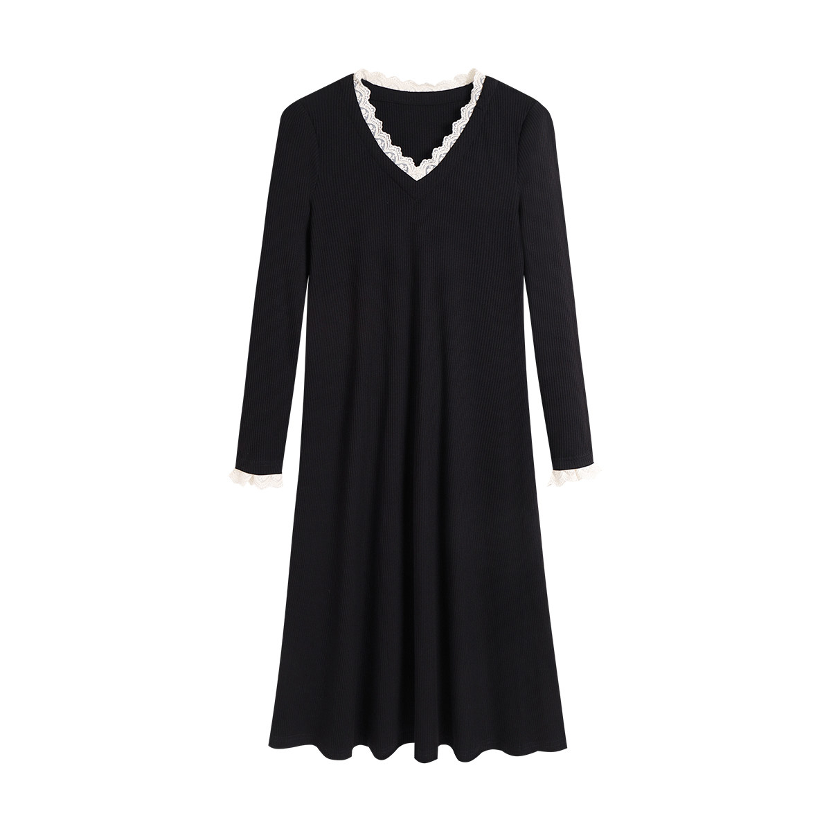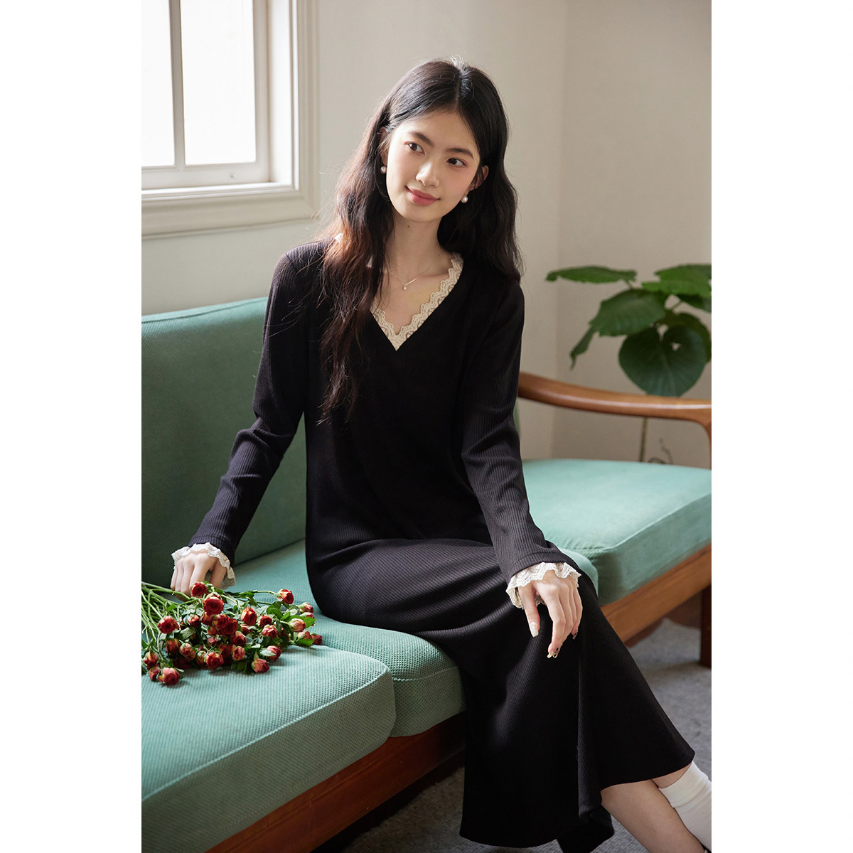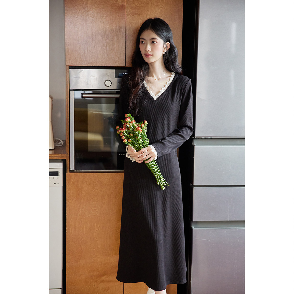弥古黑色长袖针织连衣裙女高级感2025秋冬内搭法式蕾丝打底裙长裙