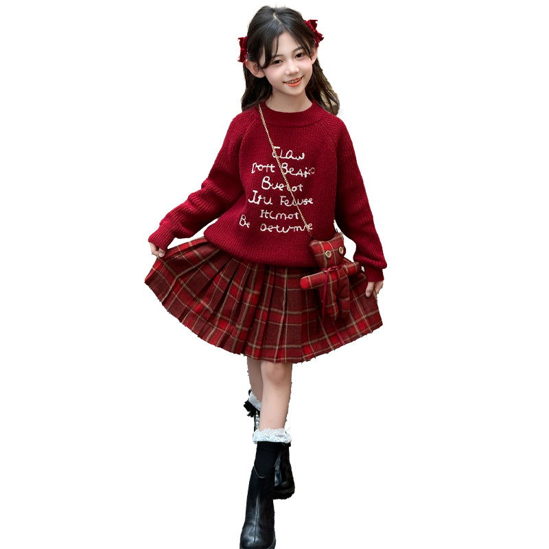 女童连衣裙秋冬2025新款洋气大童红色毛衣套装女孩格子短裙两件套