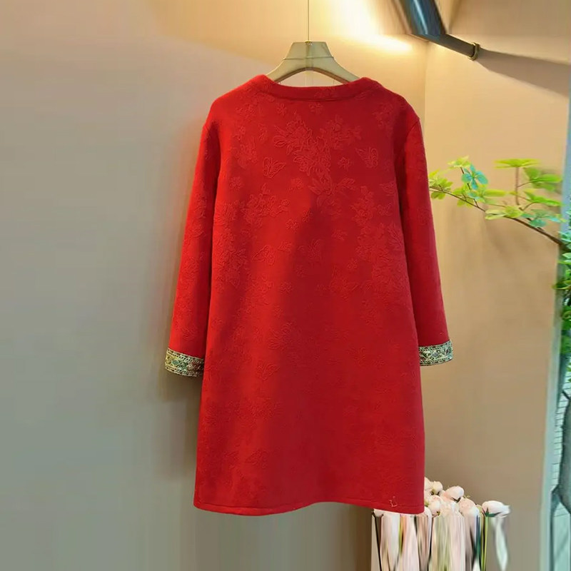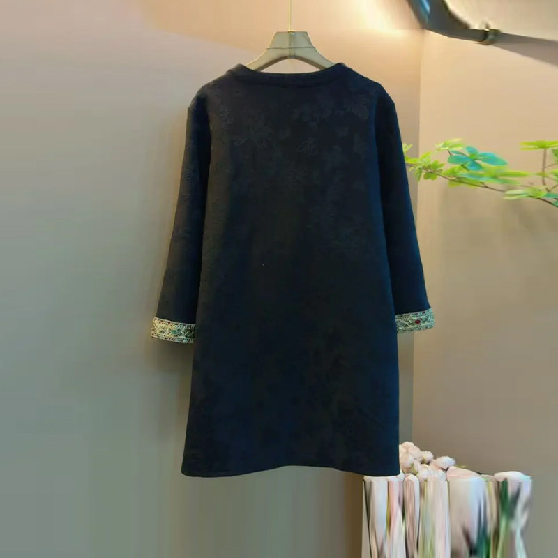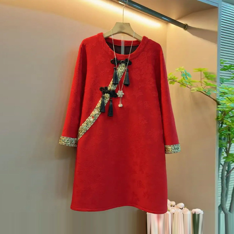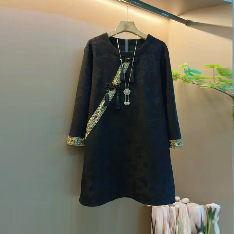 加肥胖MM流苏扣斜襟圆领连衣裙宽松遮肚子大码女装中长款复古裙子