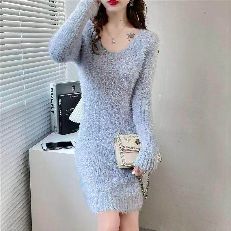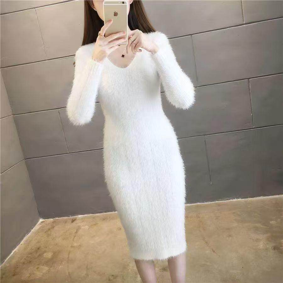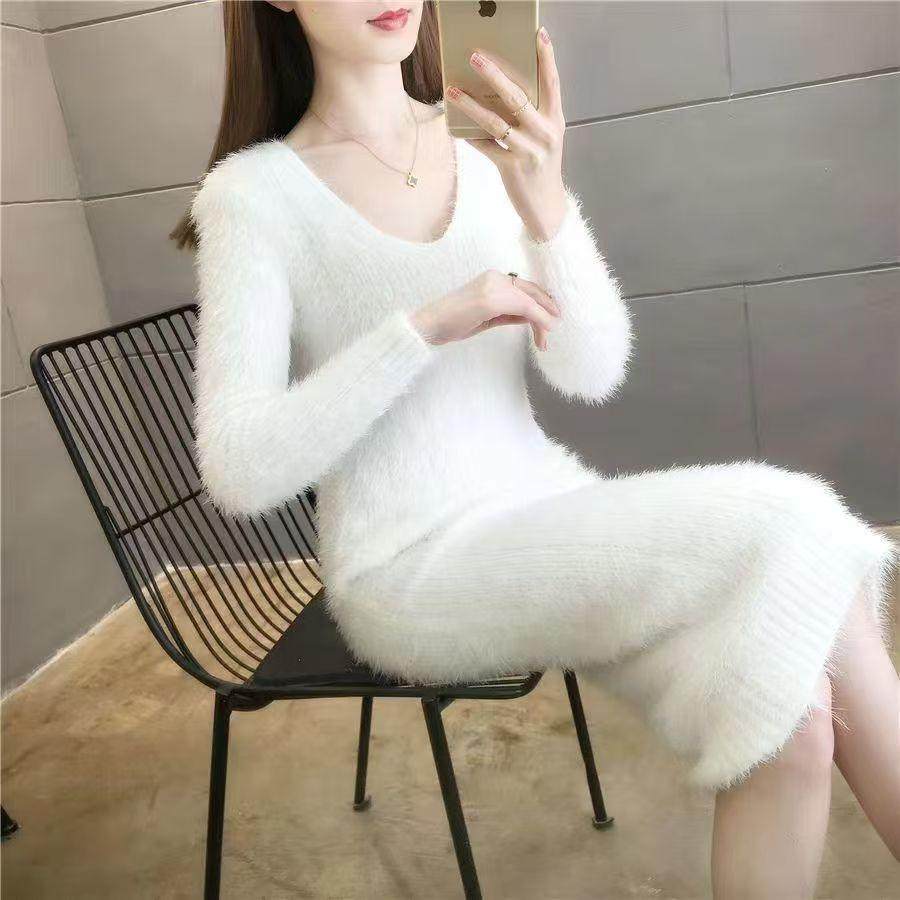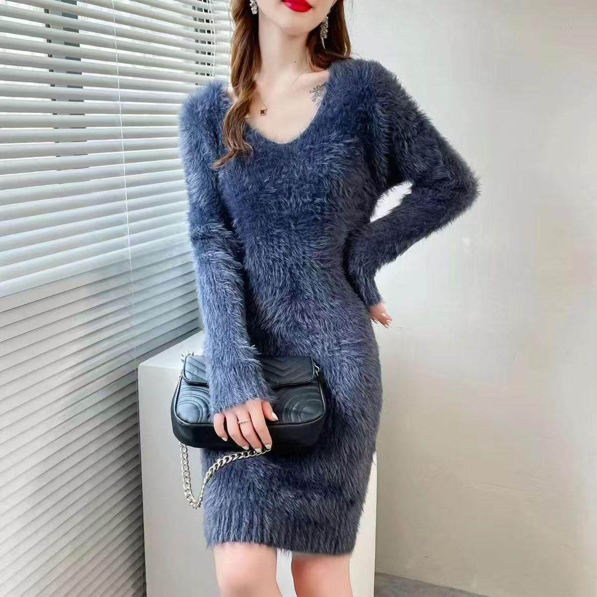 仿貂绒秋冬新款加厚修身针织毛衣连衣裙中长款配大衣打底衫百搭