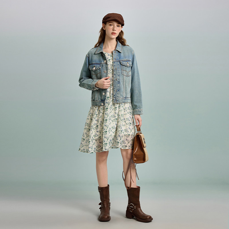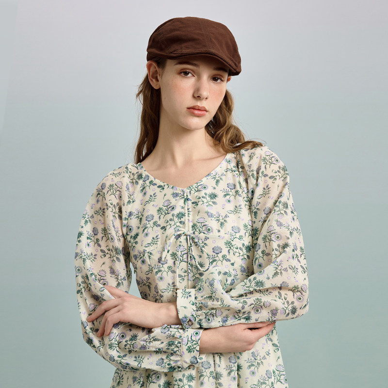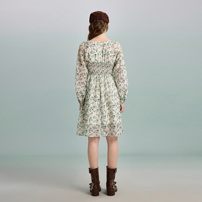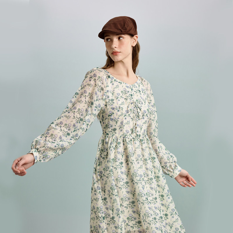 PIT长袖V领印花小碎花连衣裙收腰显瘦2025春夏新款百搭设计感