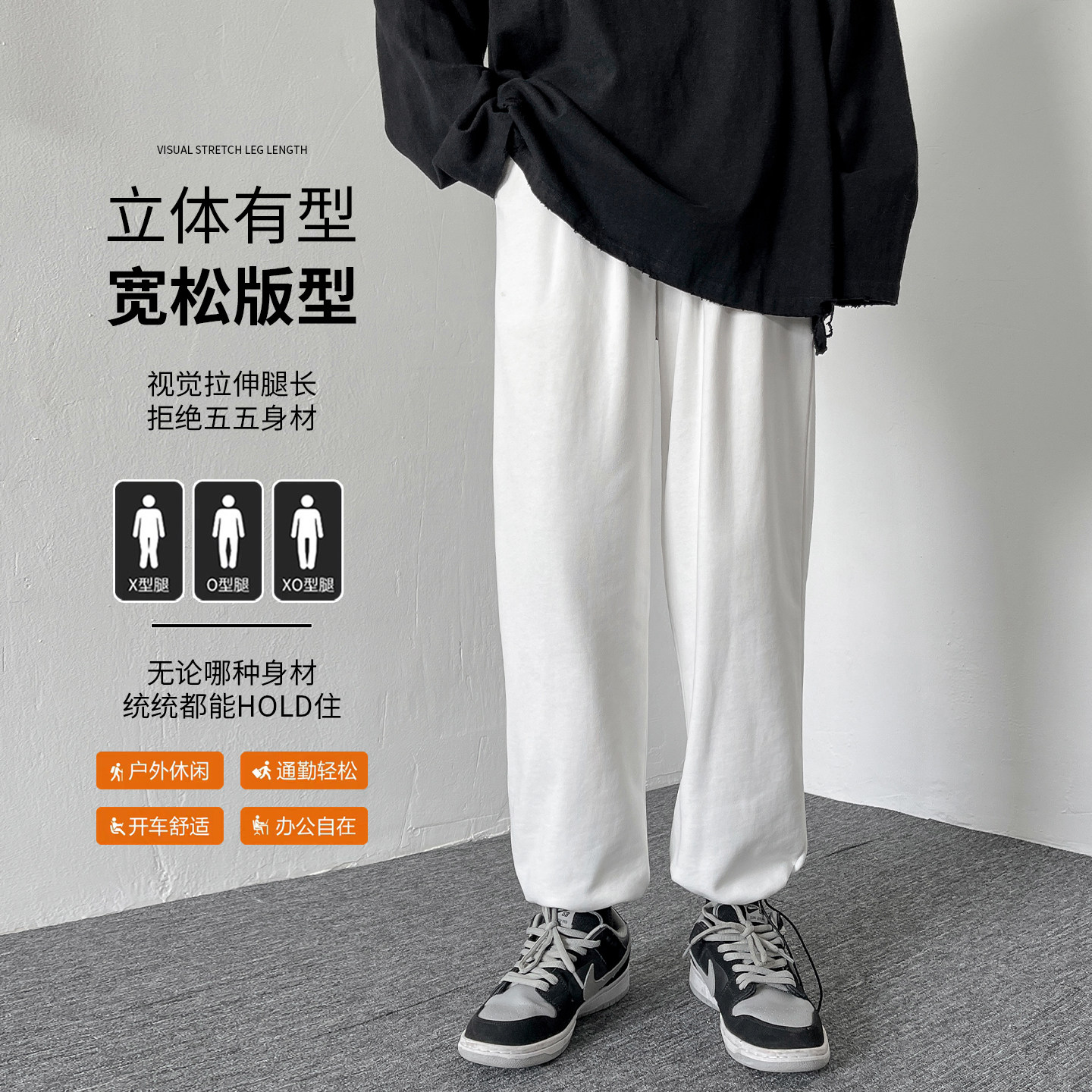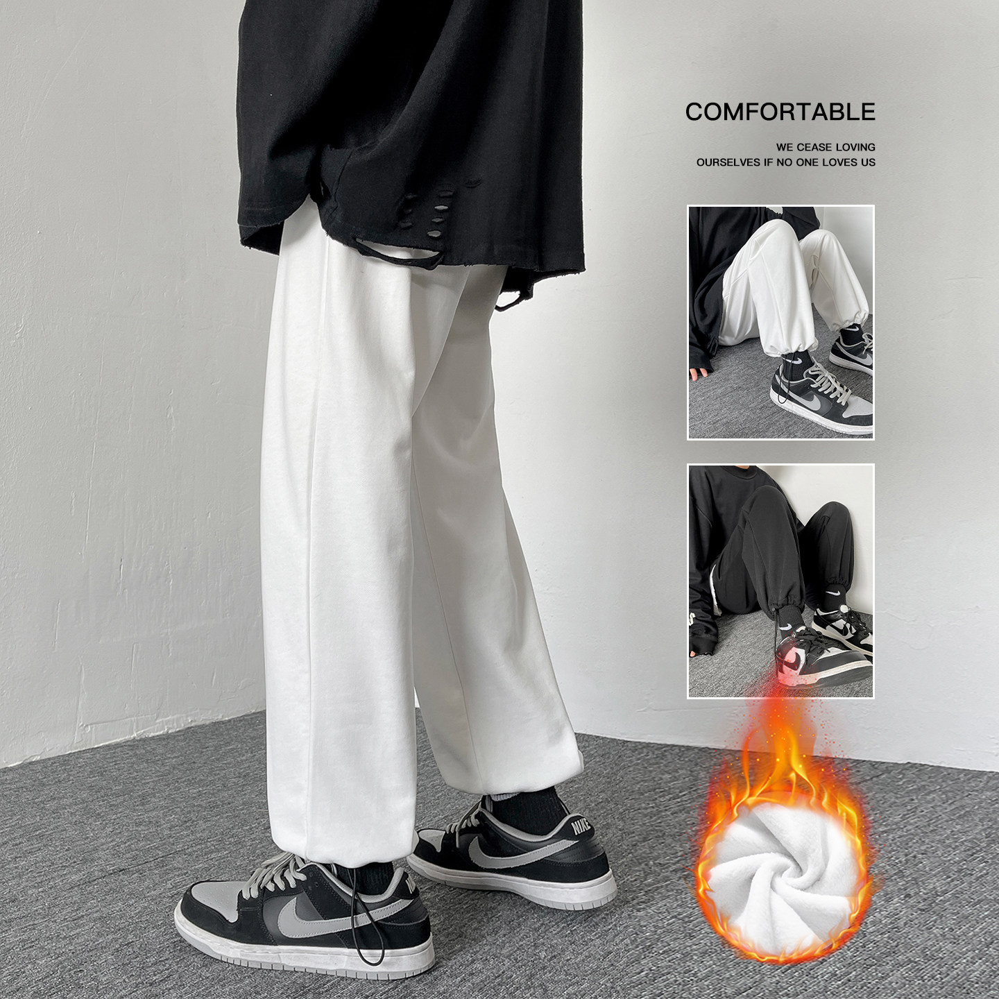 白色裤子男冬季加绒加厚美式潮流宽松直筒束脚休闲裤运动卫裤男款