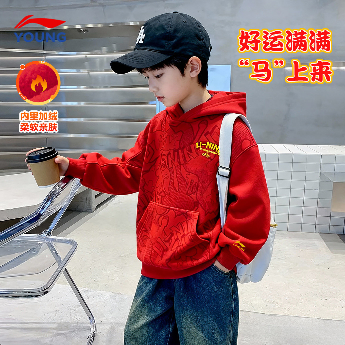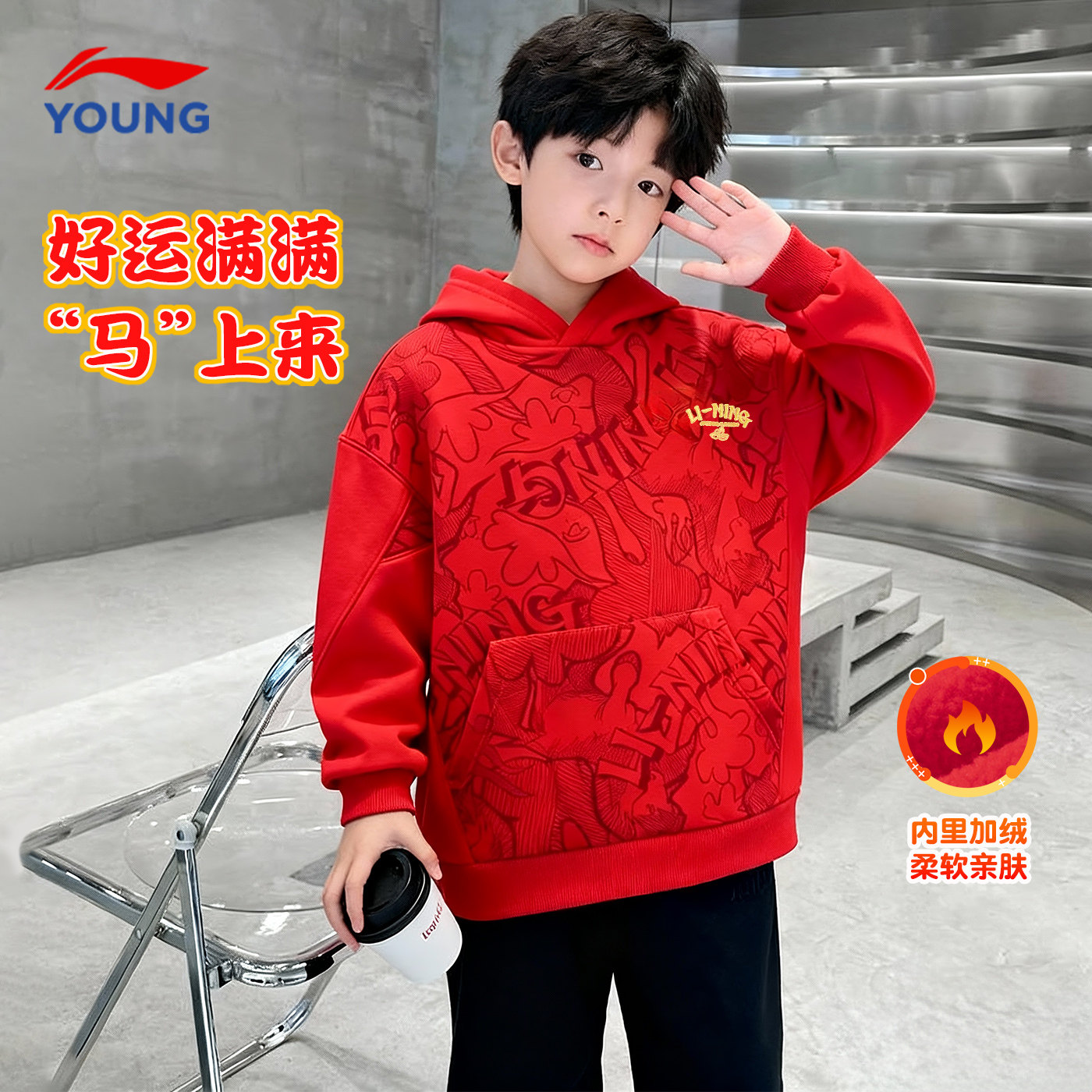 311线报网描述:李宁儿童本命年加绒卫衣连帽红色官方正品