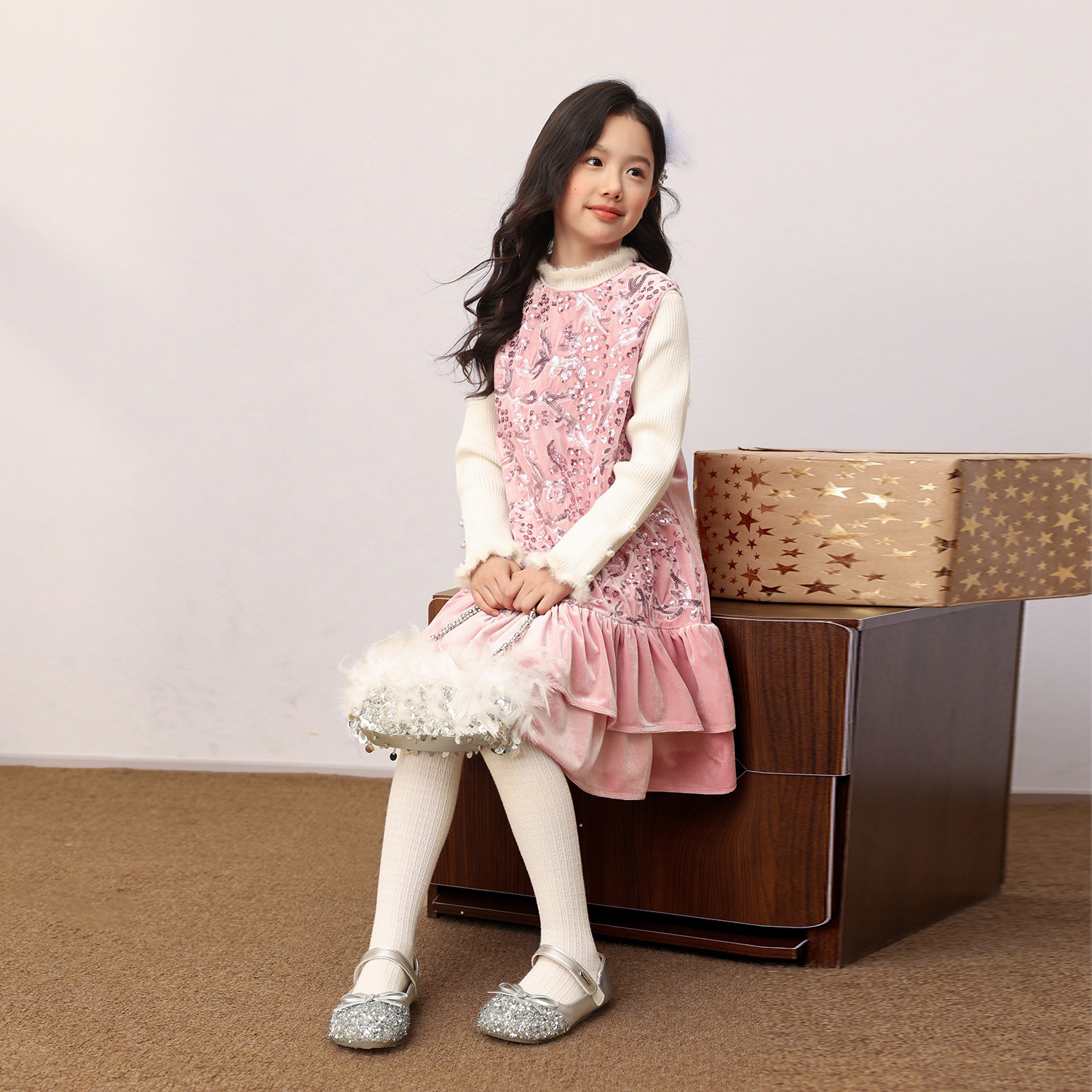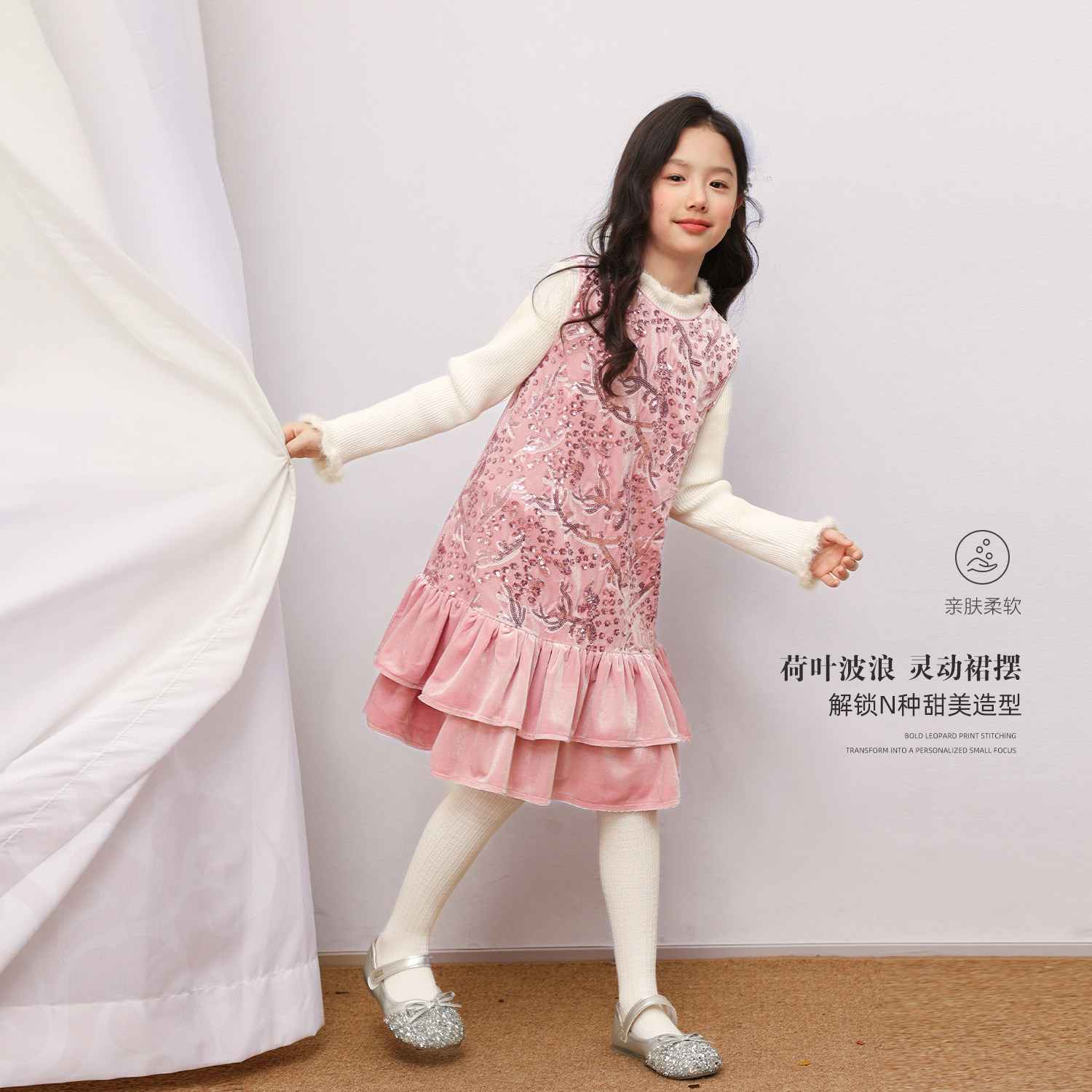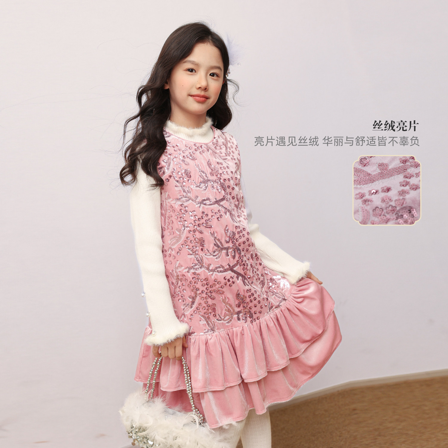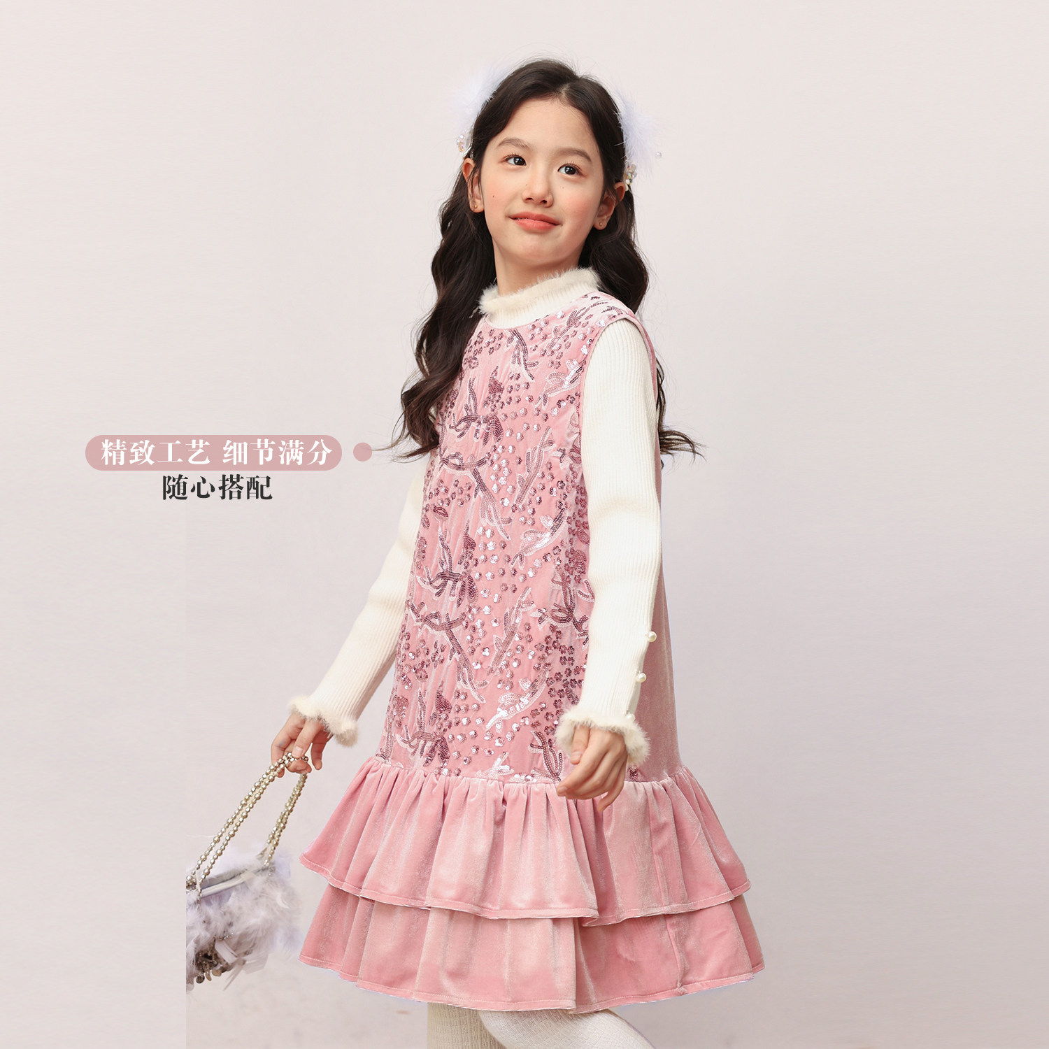NORNOR陈大猪女童亮片丝绒裙国风新款冬装好看粉色儿童背心连衣裙