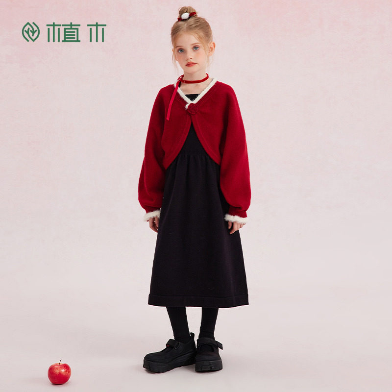 植木童装 儿童连衣裙2025秋冬新款中大童两件套套装女童连衣裙