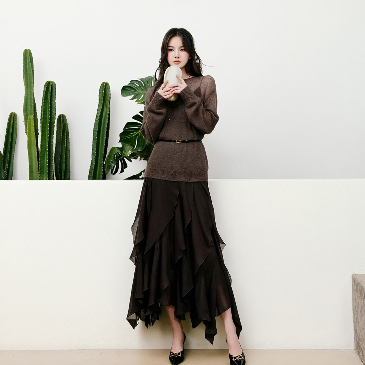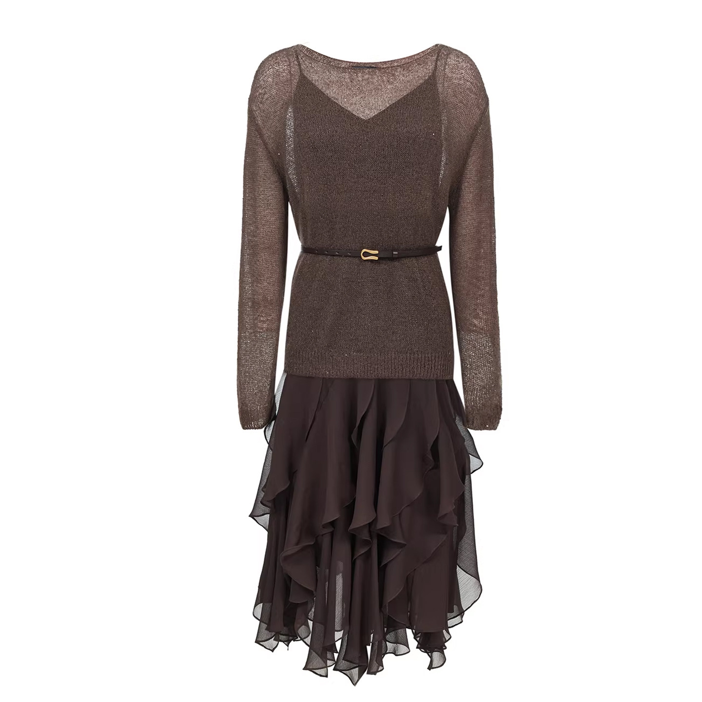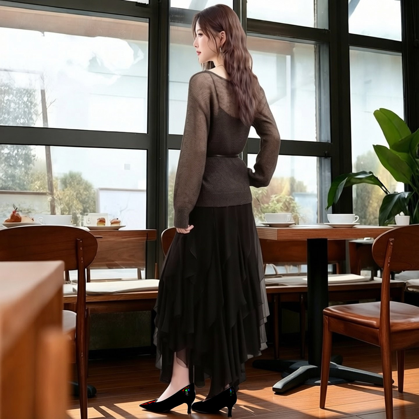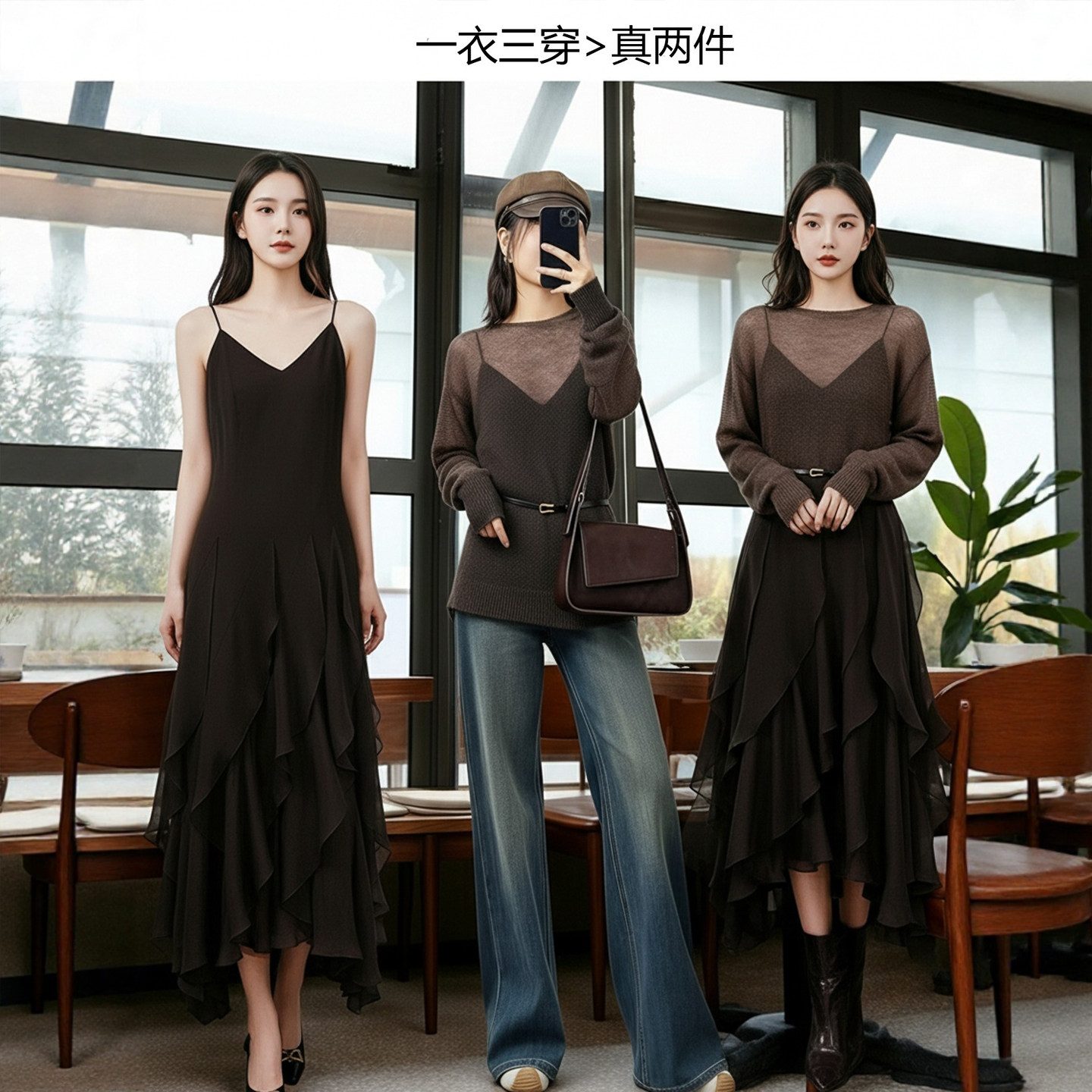 春季真两件长裙套装立体花边吊带连衣裙+圆领长袖针织衫优雅显瘦