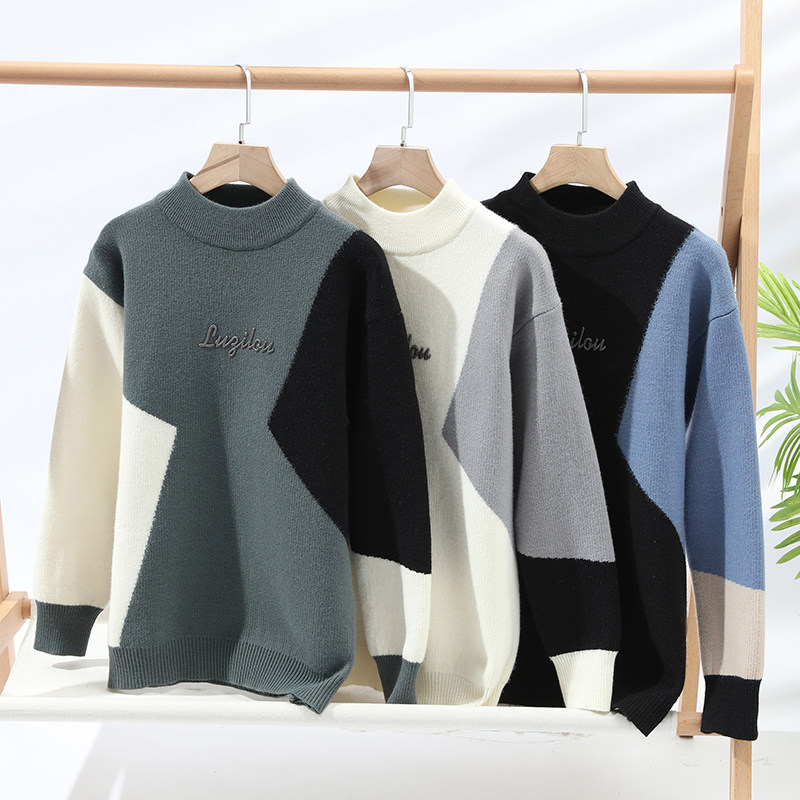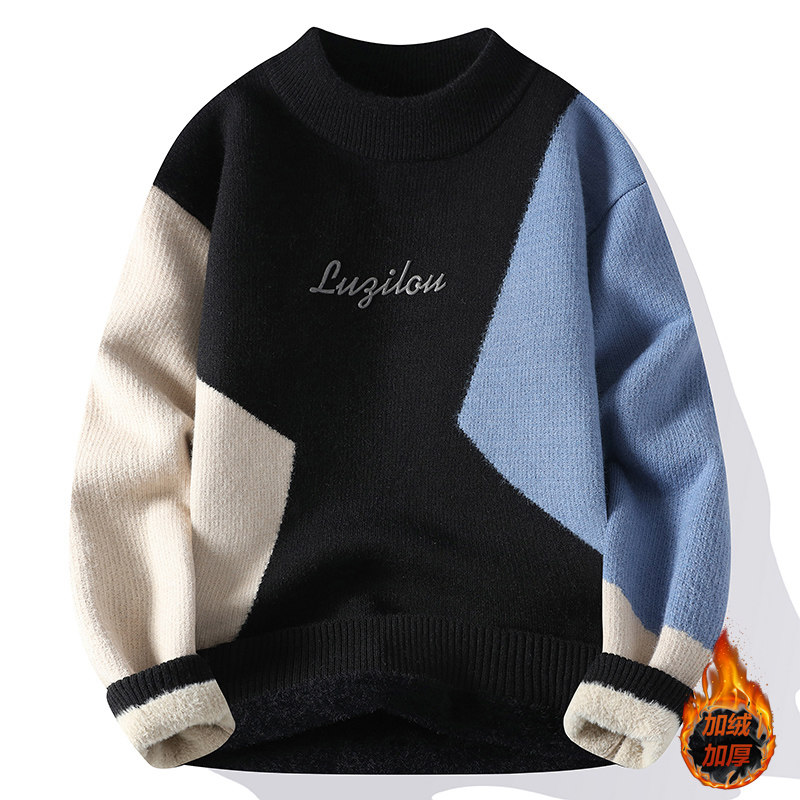 一体绒加绒加厚毛衣男秋冬季潮牌青少年初中高中学生半高领针织衫