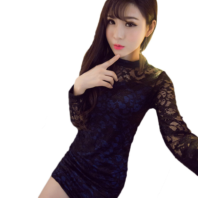 镂空性感蕾丝连衣裙秋冬新品大码裙装透肉拼接包臀短款修身打底裙