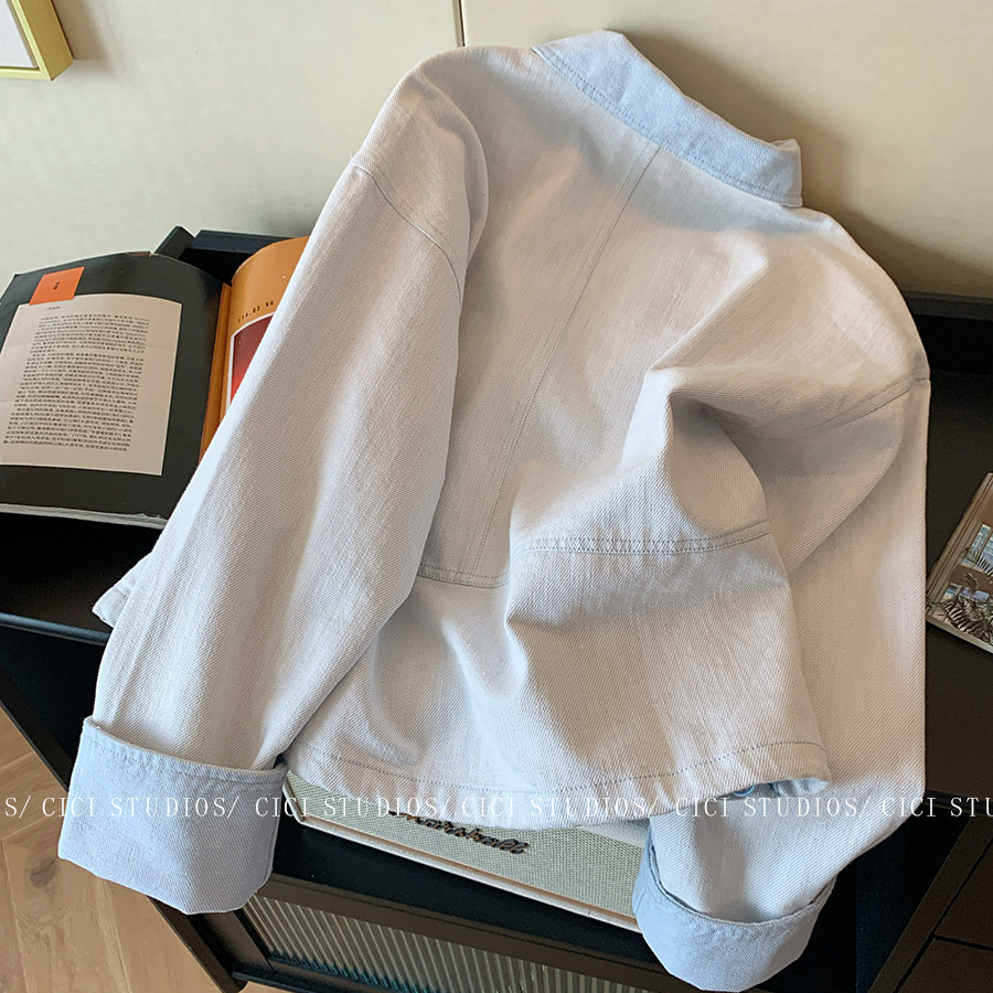 小香风浅蓝色翻领牛仔外套女秋季2025新款高级感撞色休闲夹克上衣