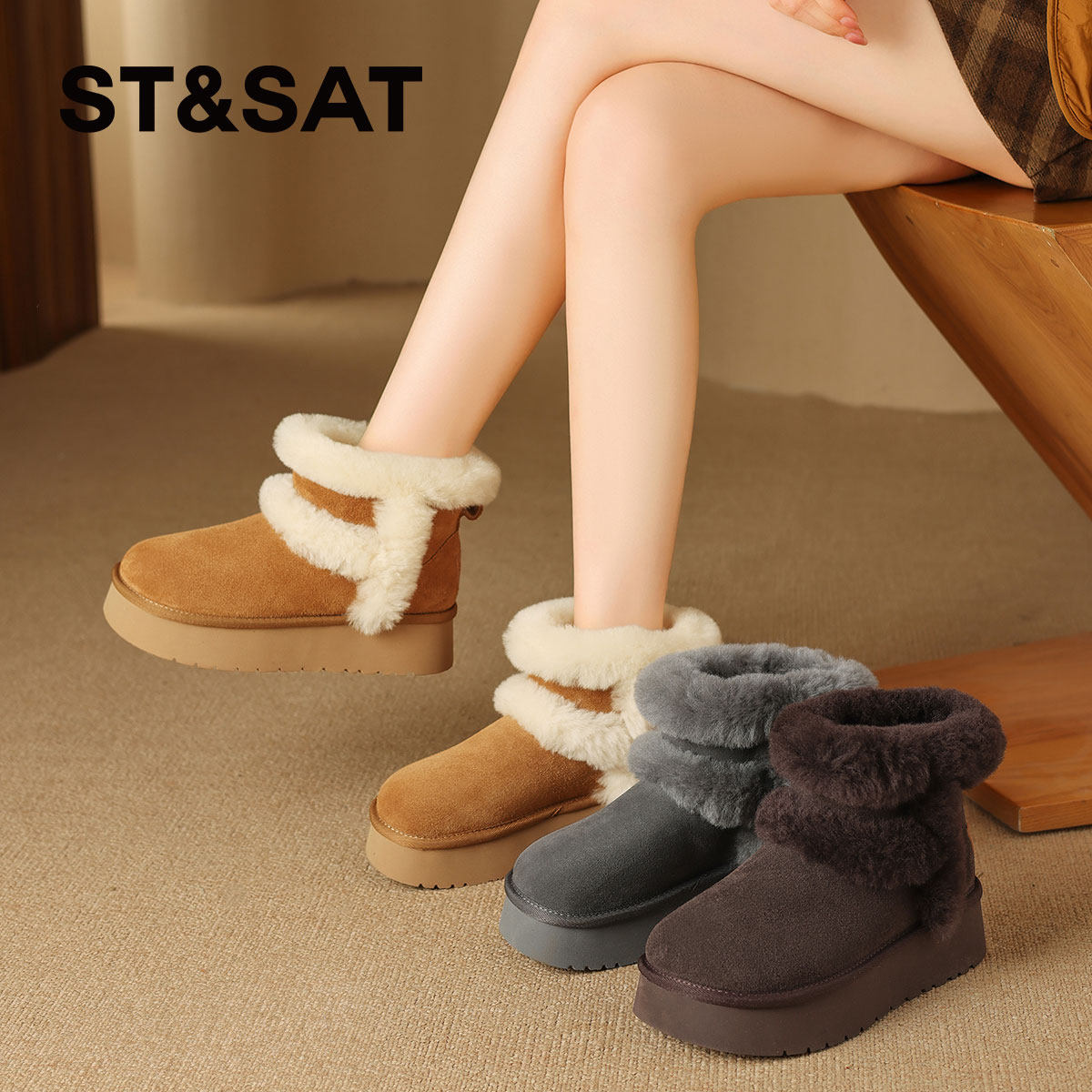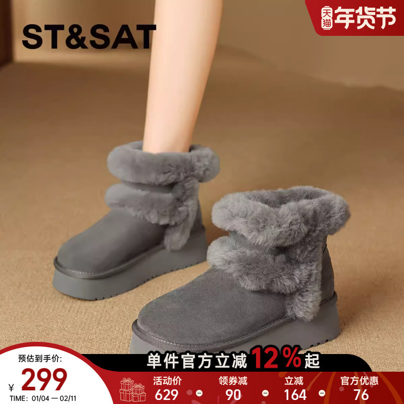 星期六真皮加绒雪地靴女款2025新款冬季保暖棉鞋毛毛鞋厚底短靴子