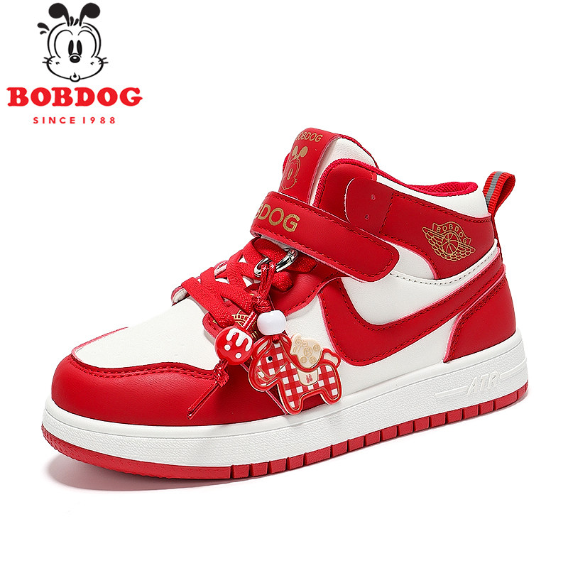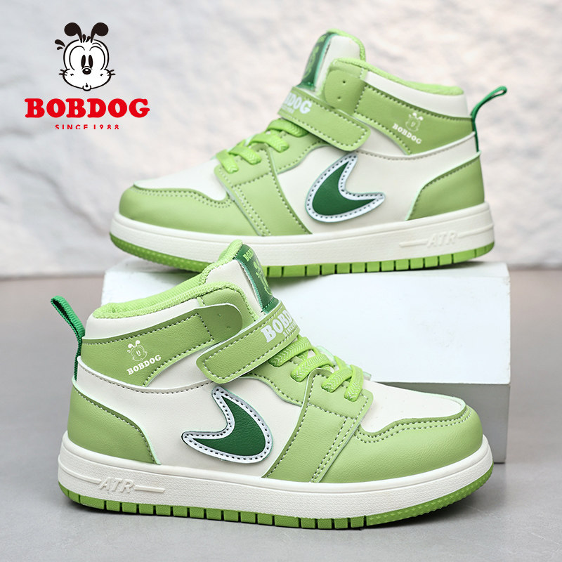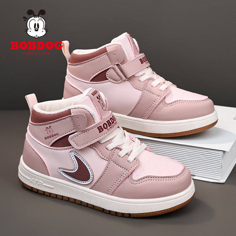 巴布豆童鞋女童高帮运动鞋春秋新款皮面防水儿童休闲鞋子男童板鞋