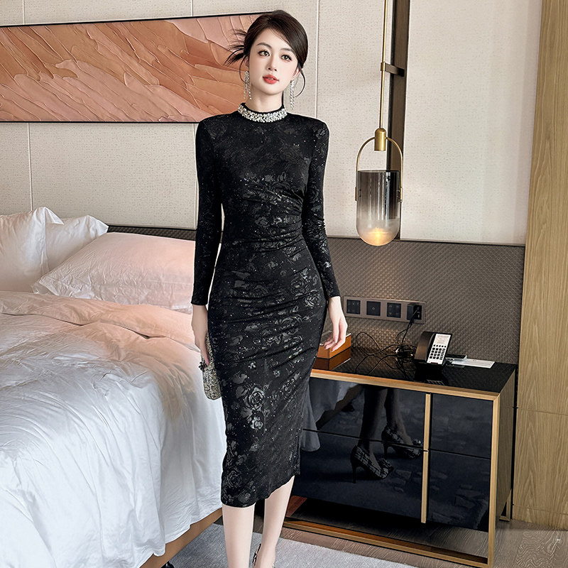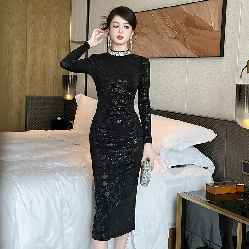 冬季黑色包臀连衣裙半高领内搭女秋冬打底裙秋冬款配大衣气质长裙