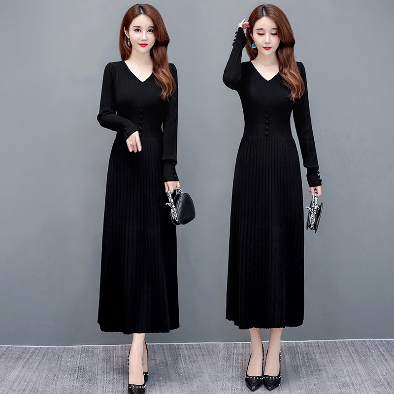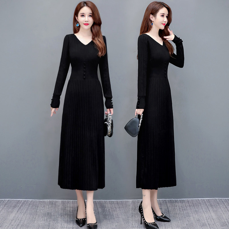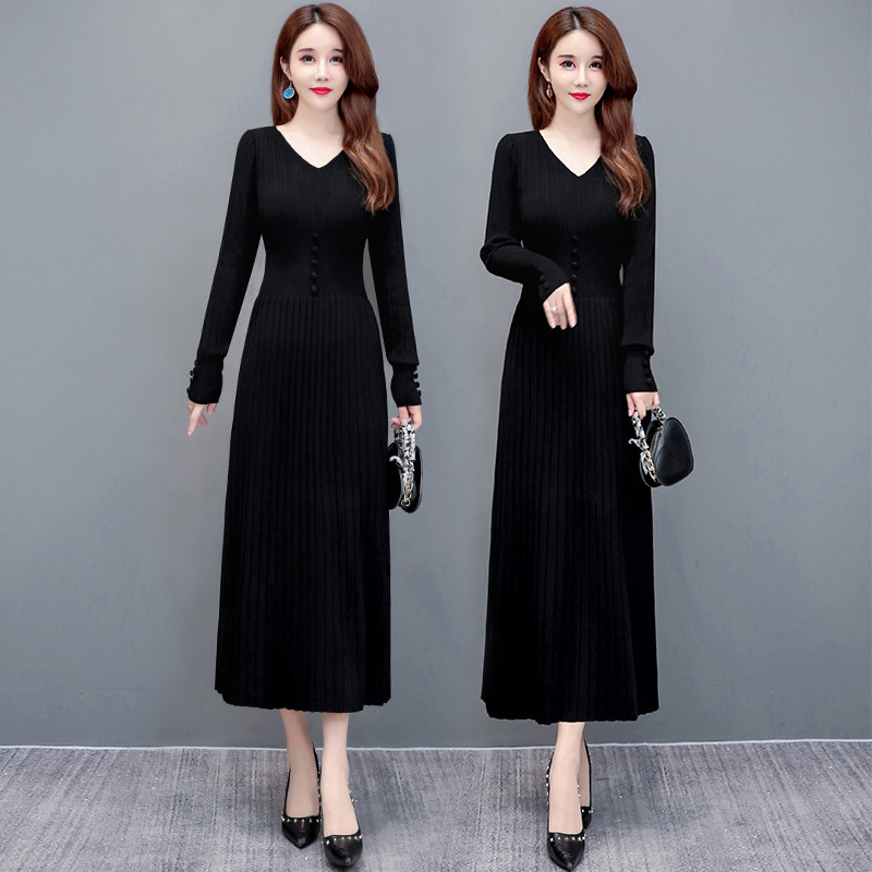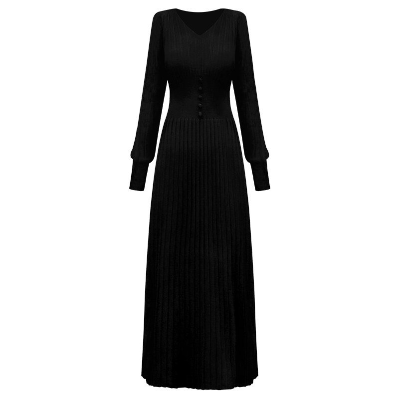 黑色针织连衣裙女秋冬2025新款修身显瘦配大衣毛衣长裙百褶裙子秋