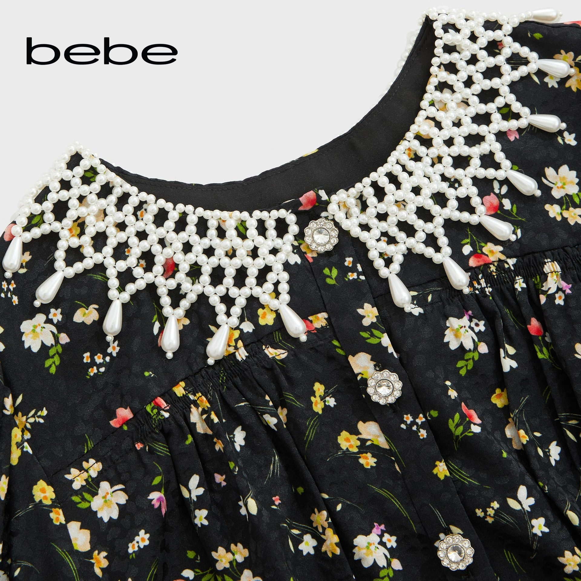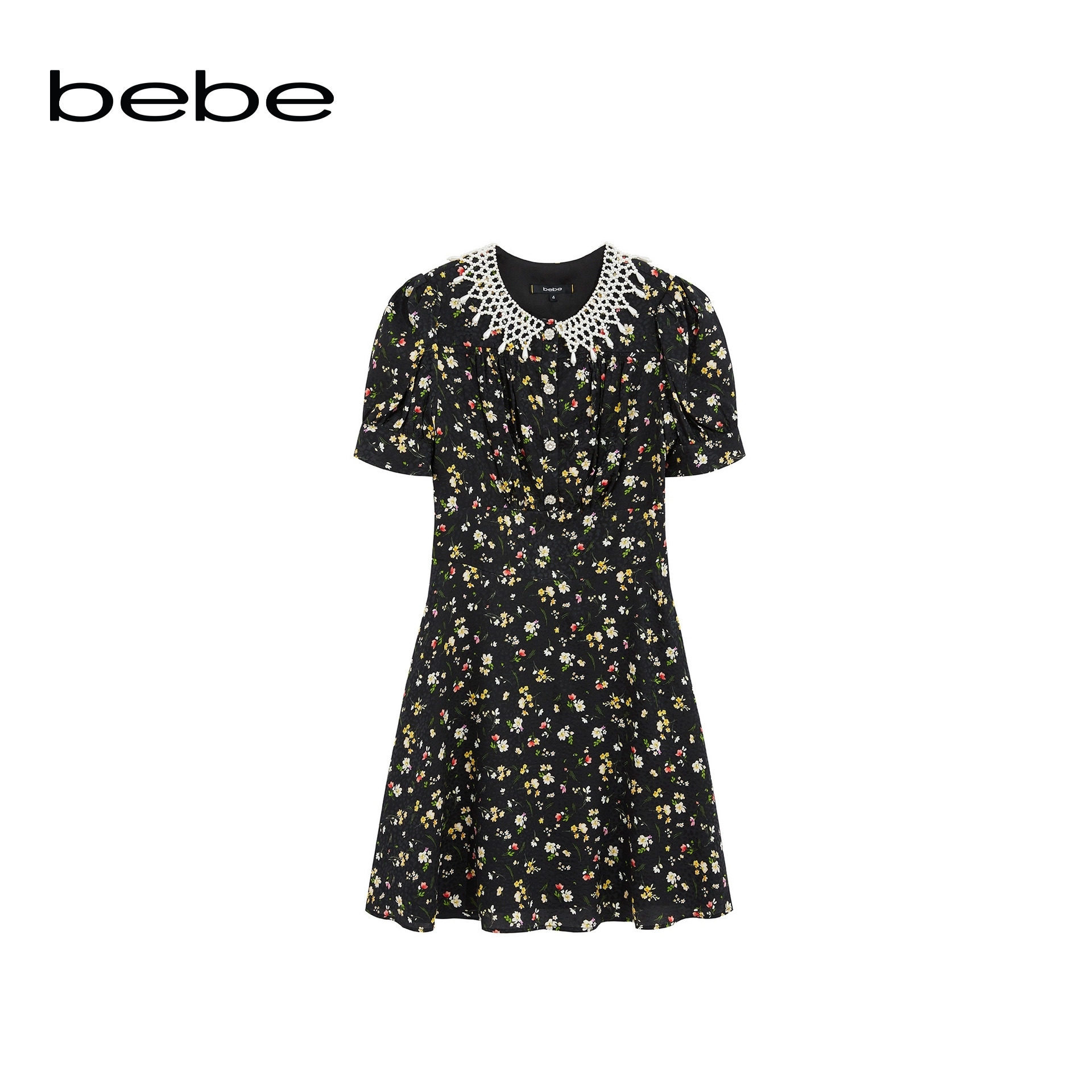 bebe2026年夏季新款女士碎花印花仿珍珠领泡泡袖连衣裙250001