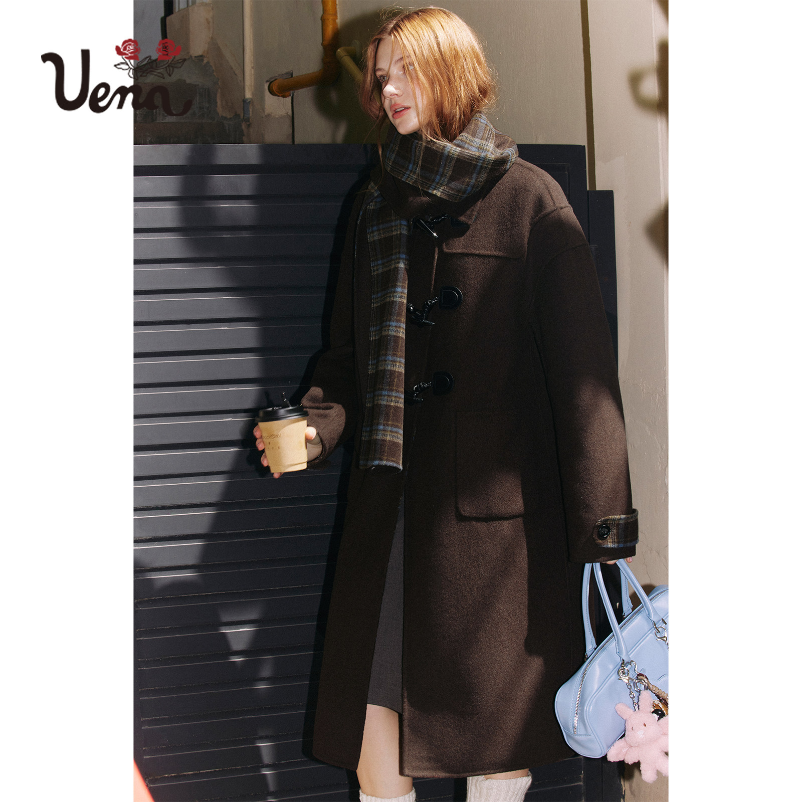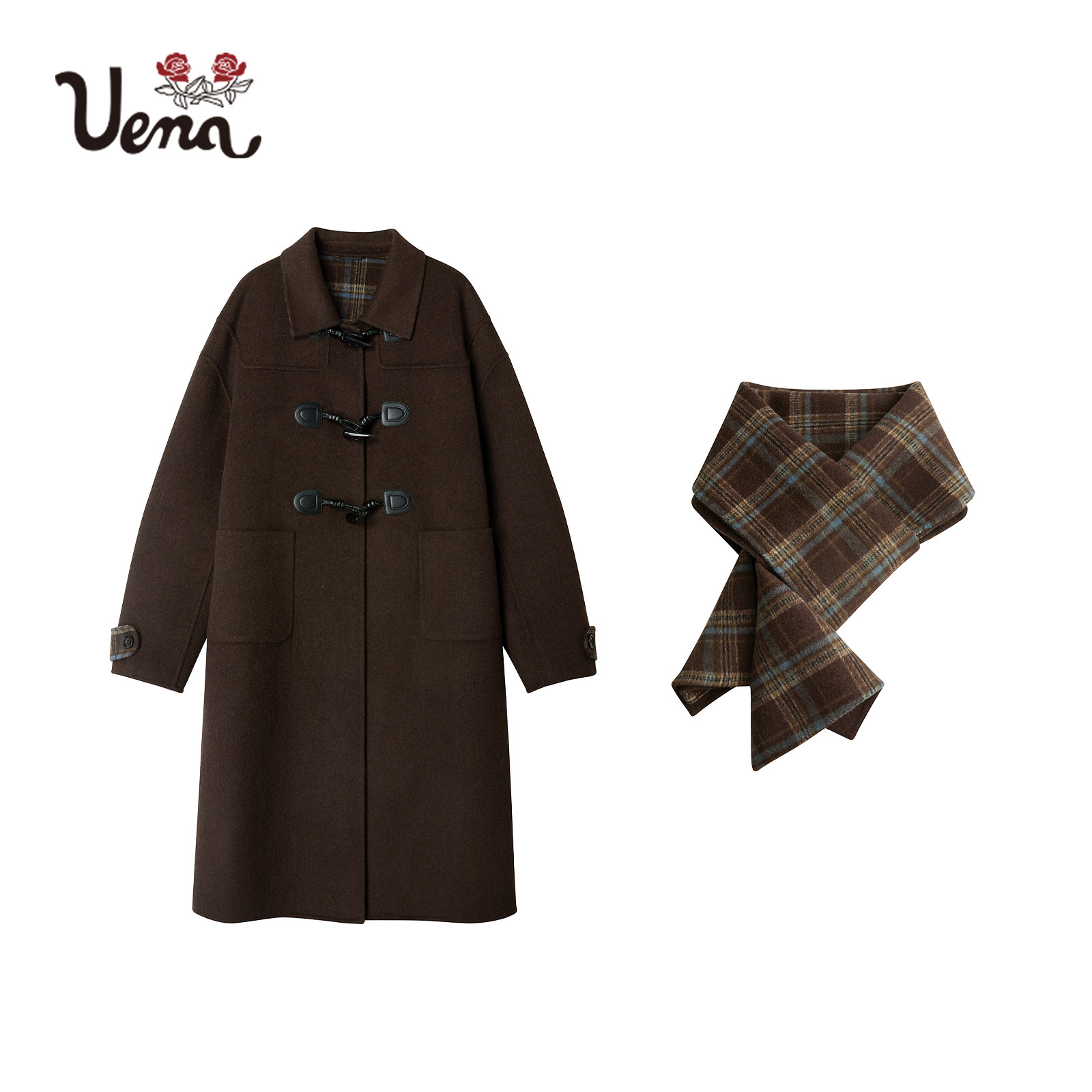 【剑桥晚风】Uena棕色牛角扣长款绵羊毛双面呢大衣外套附格纹围巾