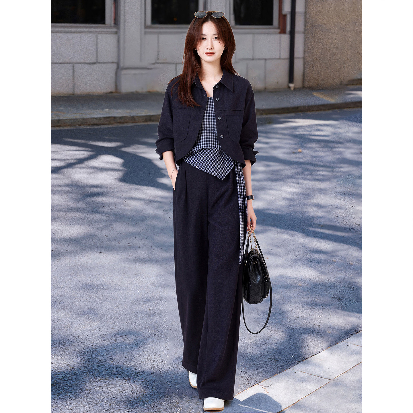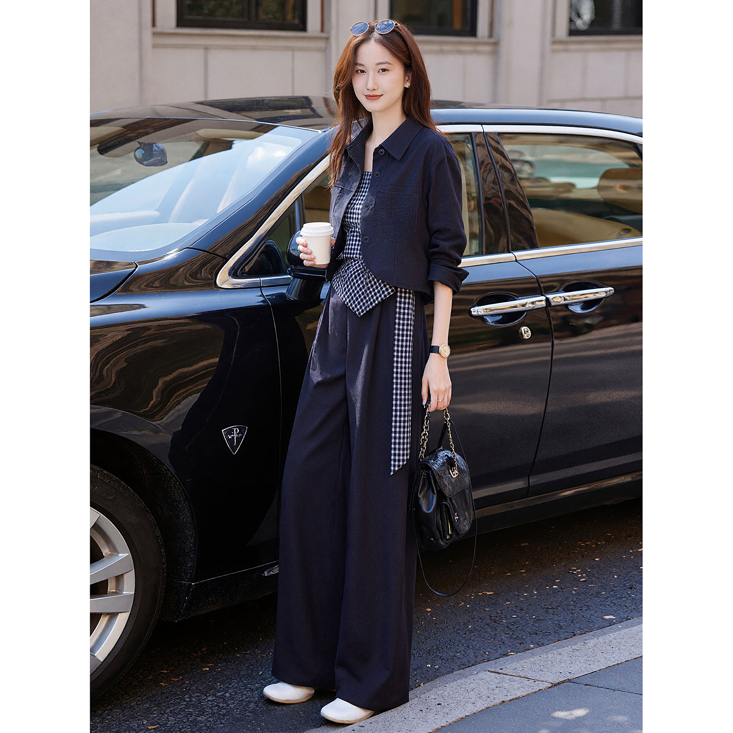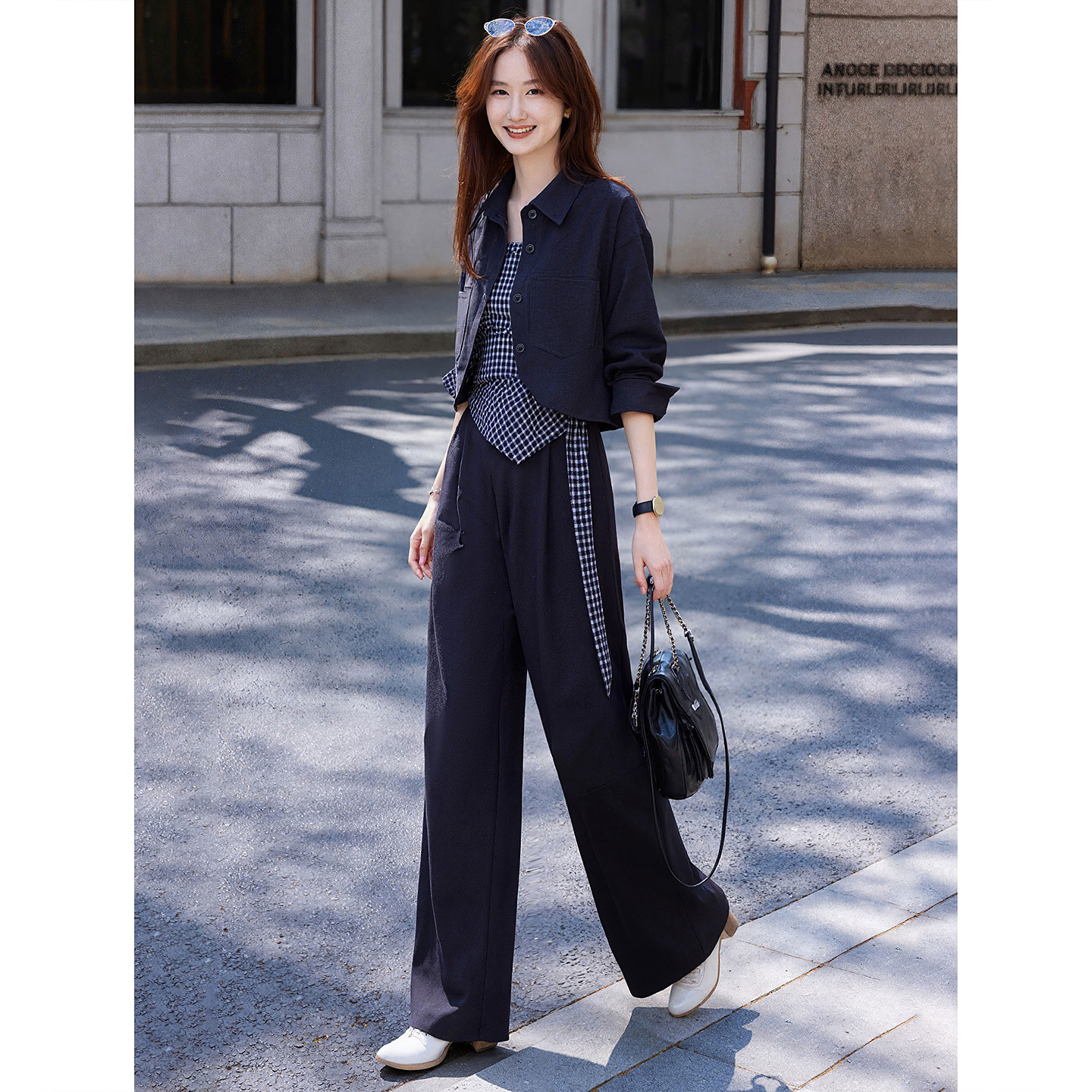 2026年春季新款夹克外套不规则格子吊带直筒裤子长裤套装女三件套