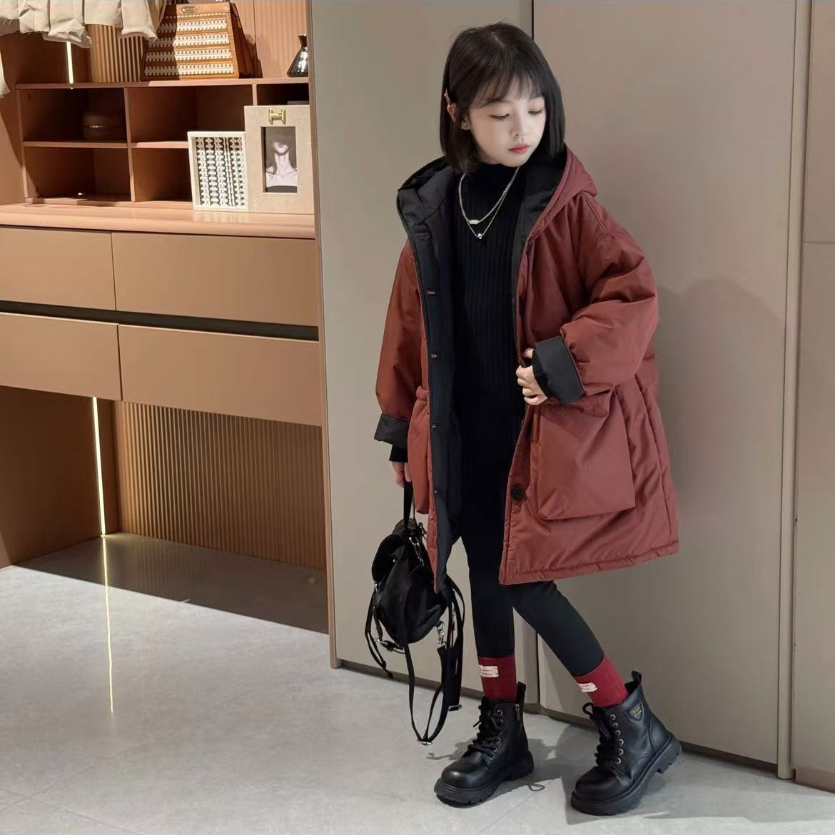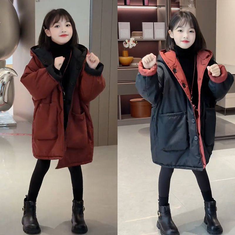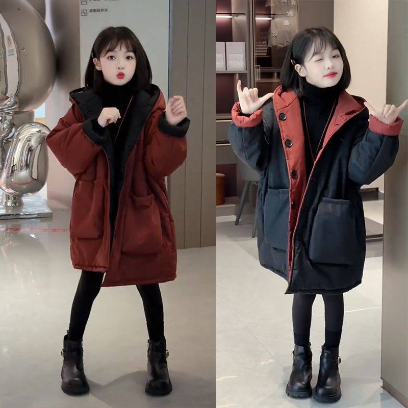 女童冬季中长款加厚纯色棉袄时髦连帽洋气棉服过年中大童秋冬外穿