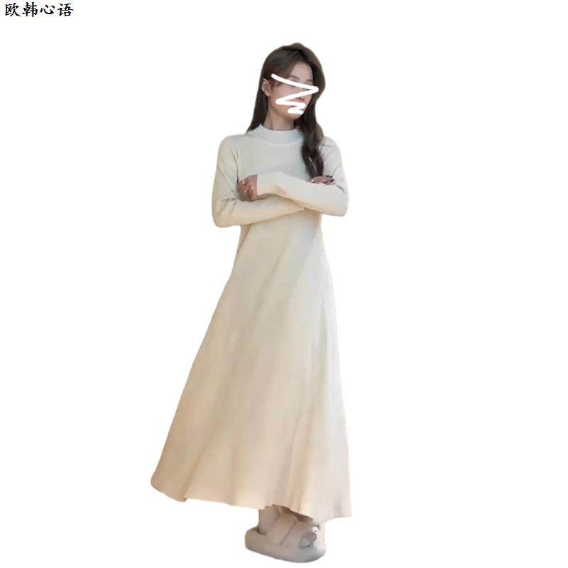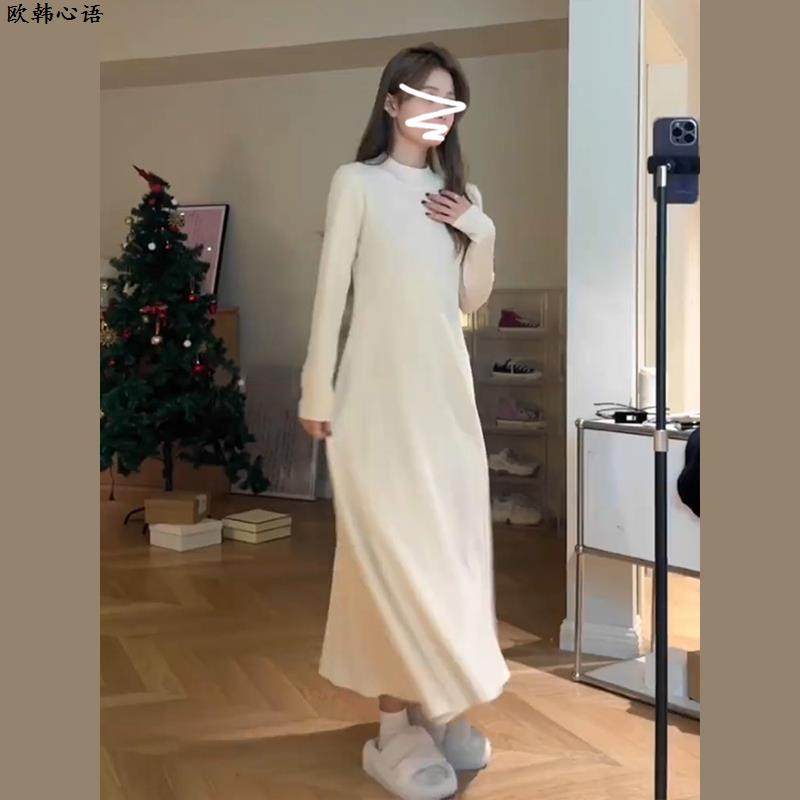 配大衣半高领白色针织连衣裙子女秋冬2025新款高级感内搭打底长裙