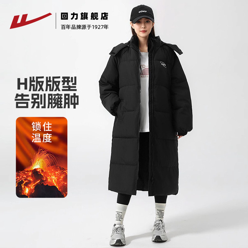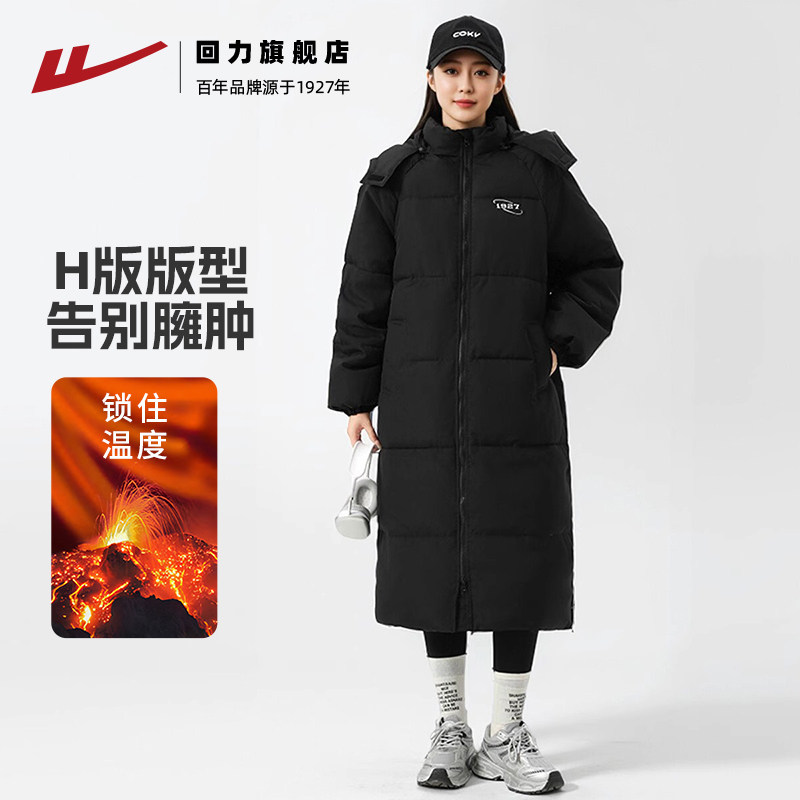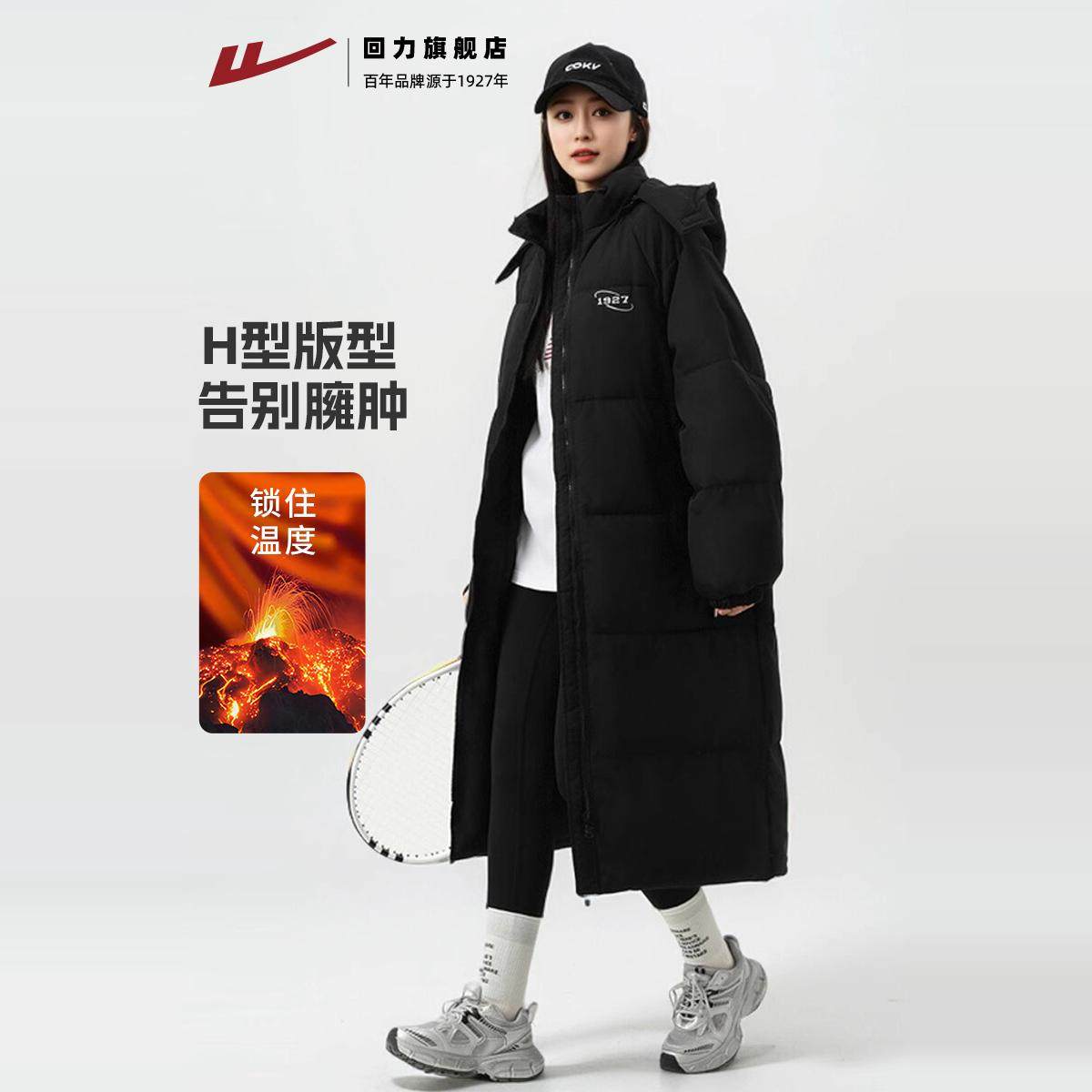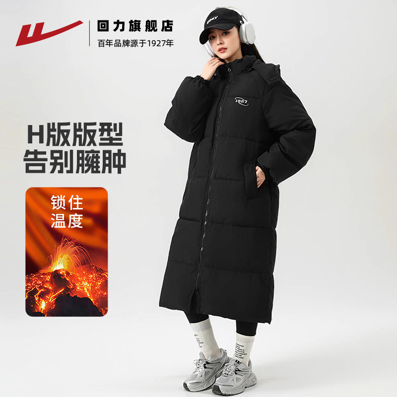 回力长款羽绒棉服女2025新款冬季外套加厚棉袄黑色过膝中长款棉衣