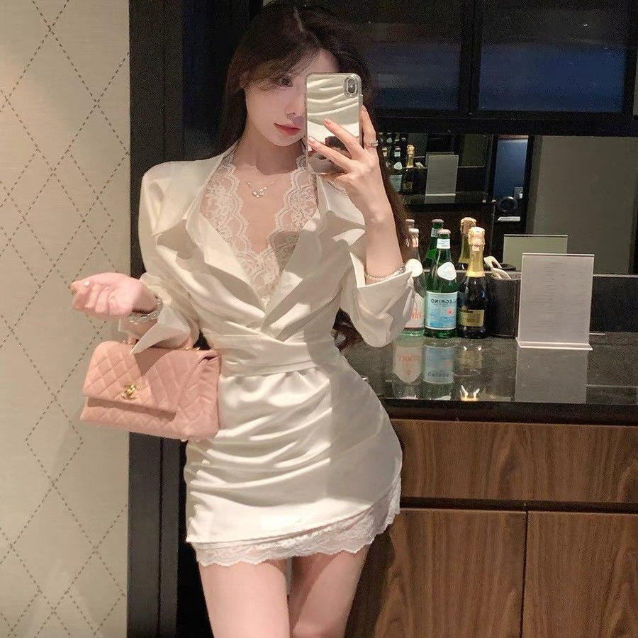 法式性感蕾丝拼接衬衫连衣裙女300斤大码秋季新款收腰短款包臀裙